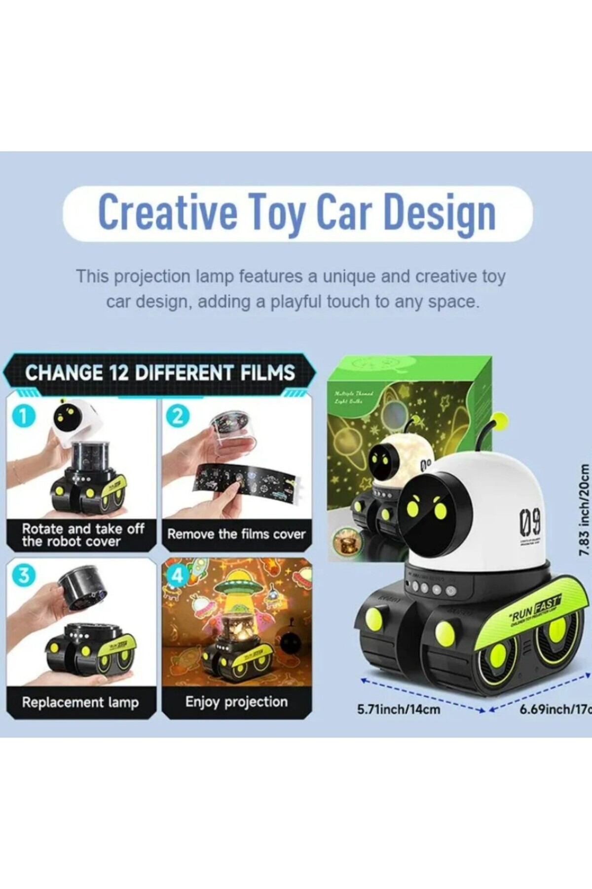 2. yaratıcı oyuncak araba tasarımı: bu projeksiyon lambası, herhangi bir alana oynak bir dokunuş ekleyerek benzersiz ve yaratıcı bir oyuncak araba tasarımına sahiptir.