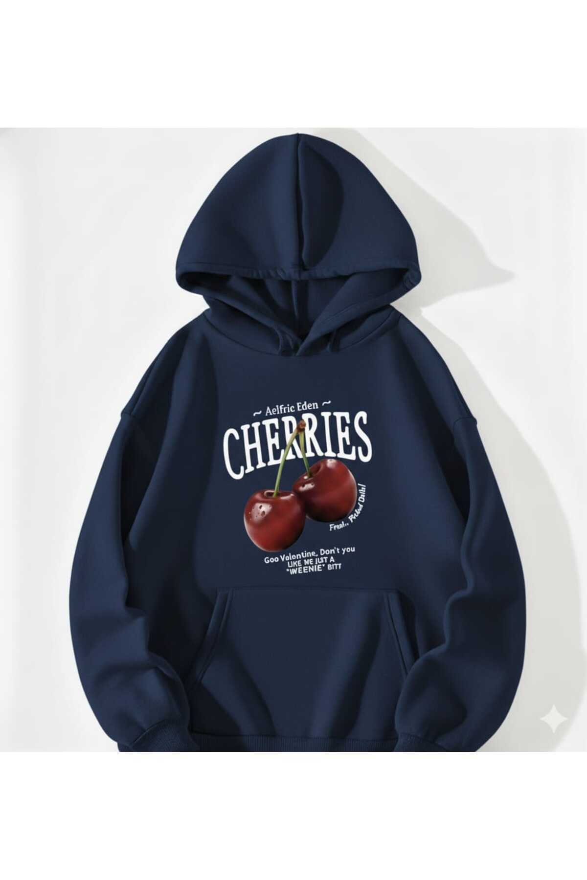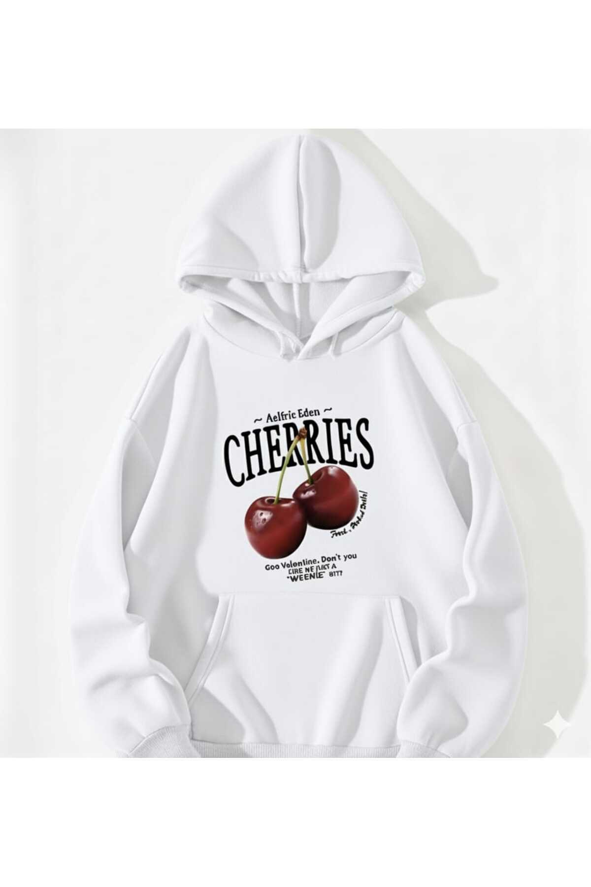 - Unisex tasarımı ile hem erkeklerin hem de kadınların rahatlıkla tercih edebileceği CHERRIES renkli özel baskılı pamuklu oversize kapüşonlu sweatshirt.