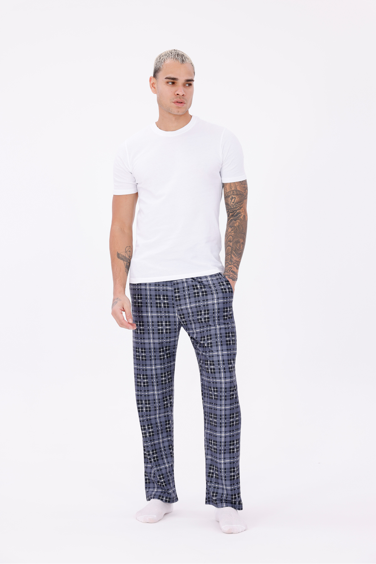 Pamuklu Kadifemsi Yumuşak Dokulu Cepli Ekose Baskılı Beli Lastikli Erkek Pijama Altı Füme-Beyaz