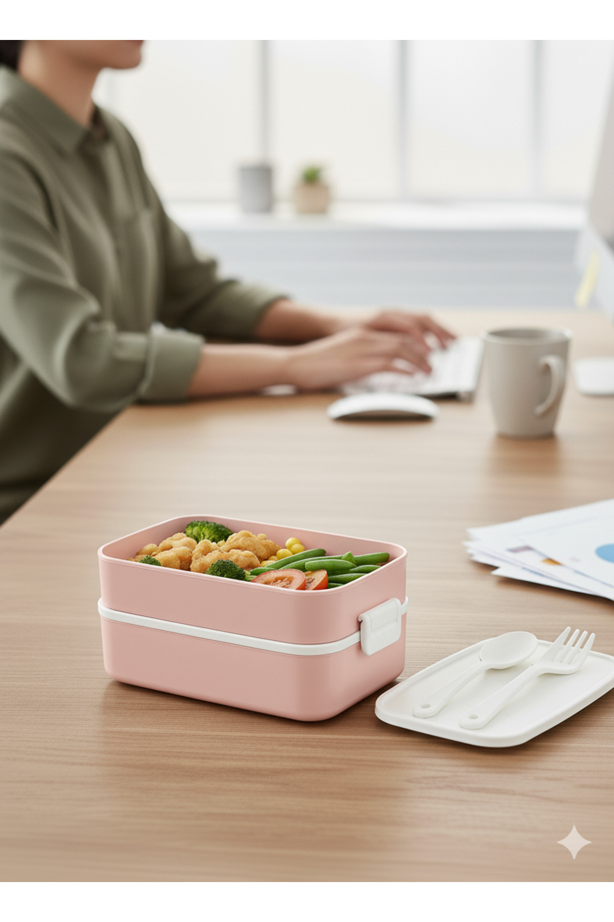 Lunch Box Kendinden Çatal Kaşıklı Estetik 2 Katlı Taşınabilir Yemek Kabı