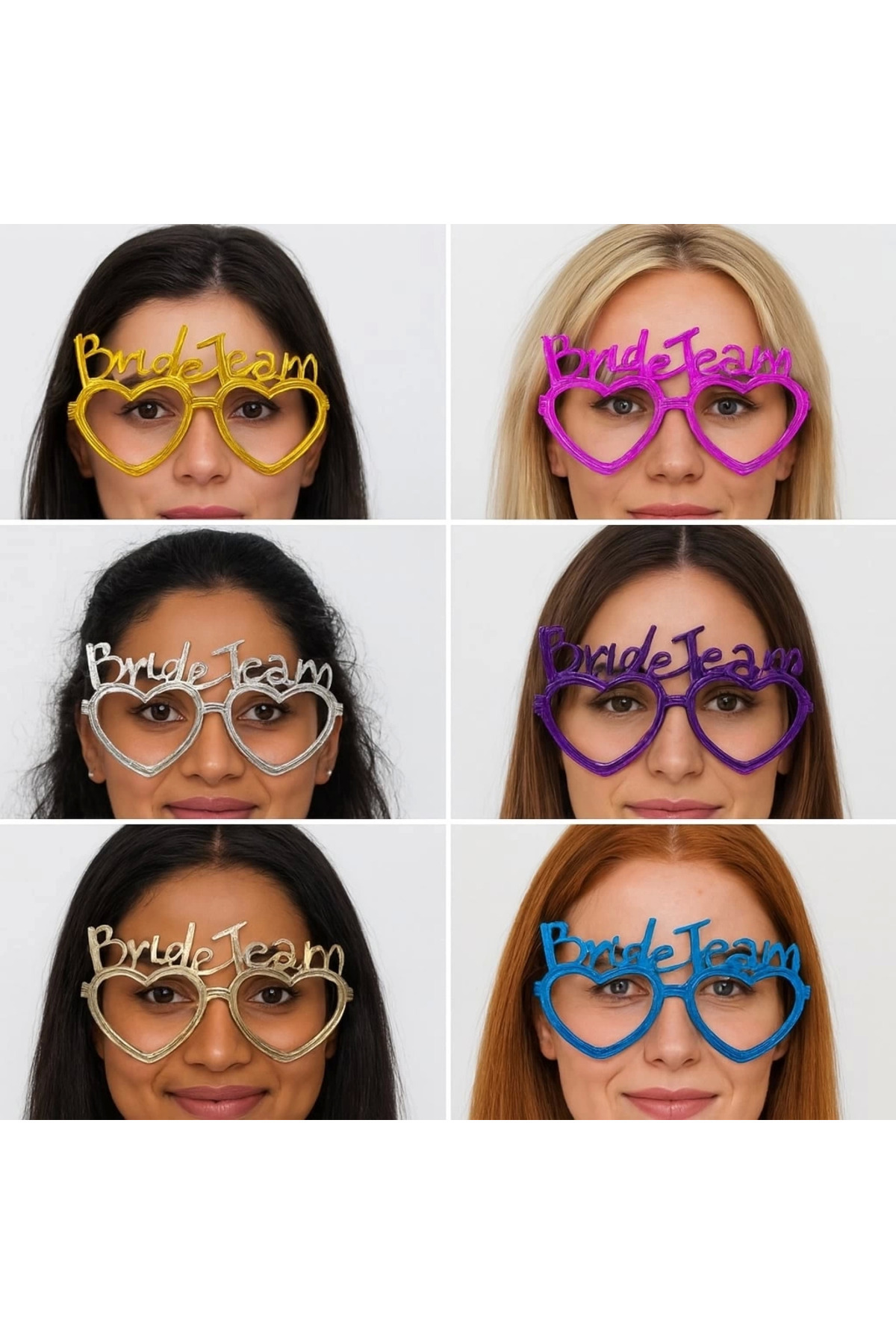 Gözlüklerin üst kısmında yer alan "Bride Team" yazısı ve kalp şeklindeki çerçeve tasarımı ile dikkat çeker.