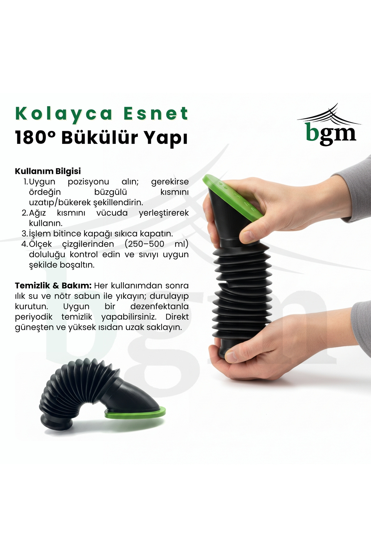 Teknik ÖzelliklerRenk: SiyahBoy (katlı/açık): 18–28 cmKapasite: 250–500 ml (gövde üzerinde işaretli)Yapı: Büzgülü, esnek akordiyon gövdeKullanım: Unisex, kapaklı, taşınabilirSertifika: CE onaylıKutu İçeriği1 × Büzgülü Akordiyon Kapaklı Idrar ÖrdeğiUyarılarKişisel hijyen ürünüdür