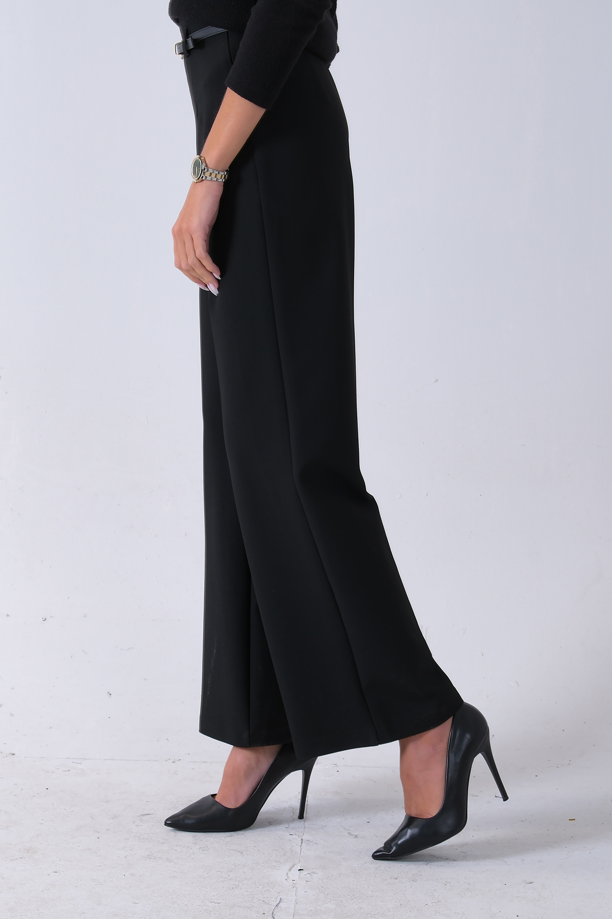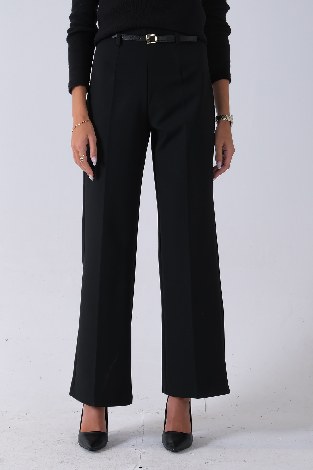 İnce Kemerli Cepsiz Bol Paça Uzun Pantolon Siyah 03030306
