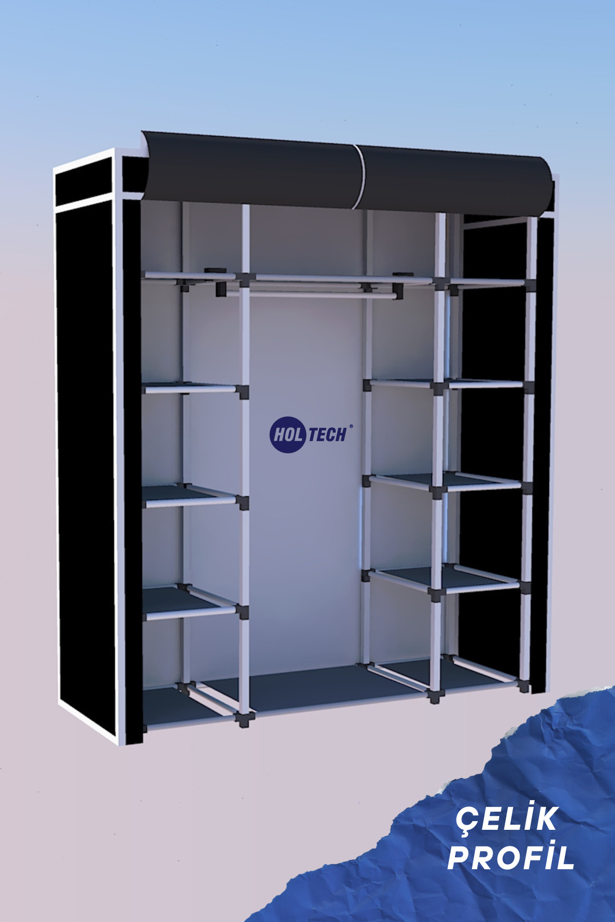 Çelik Profilli Bez Dolap Çift Yandan Raflı Süper Kumaş Gardırop Siyah