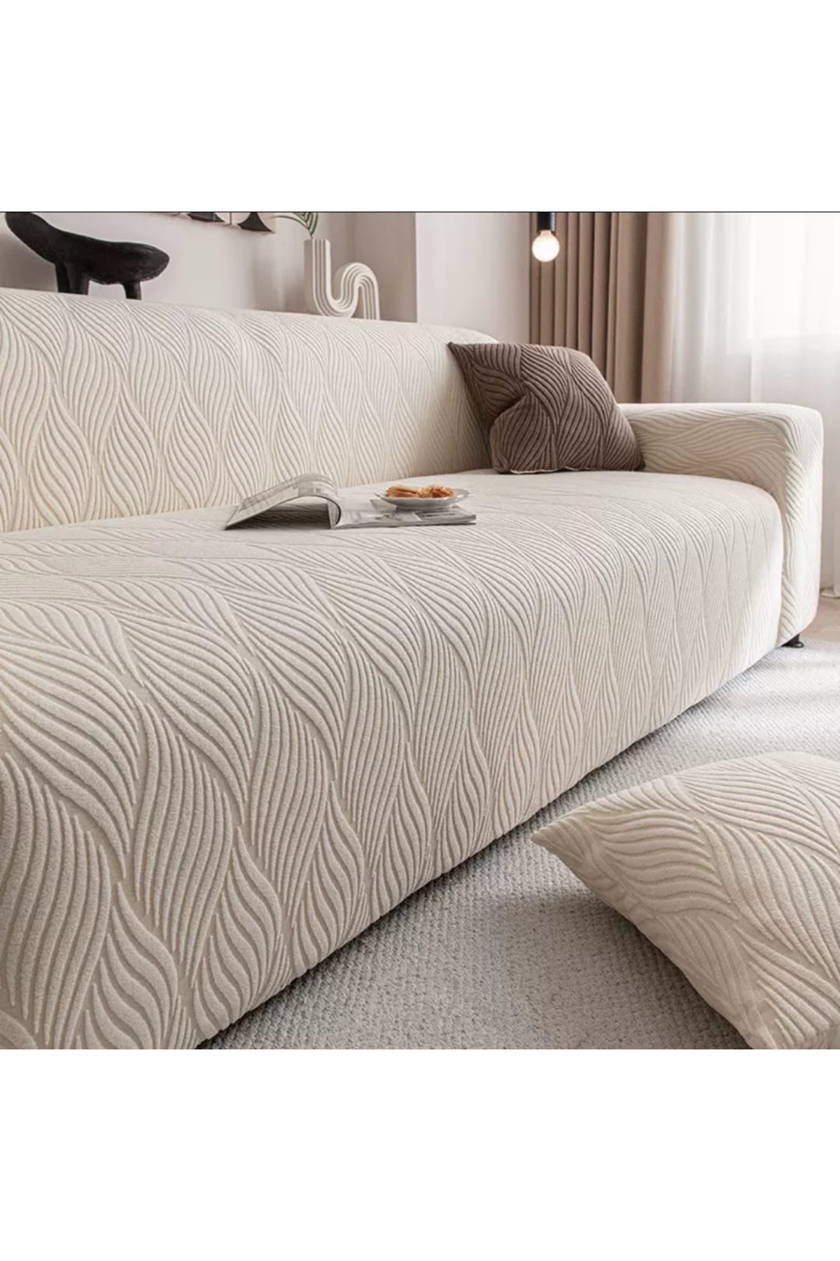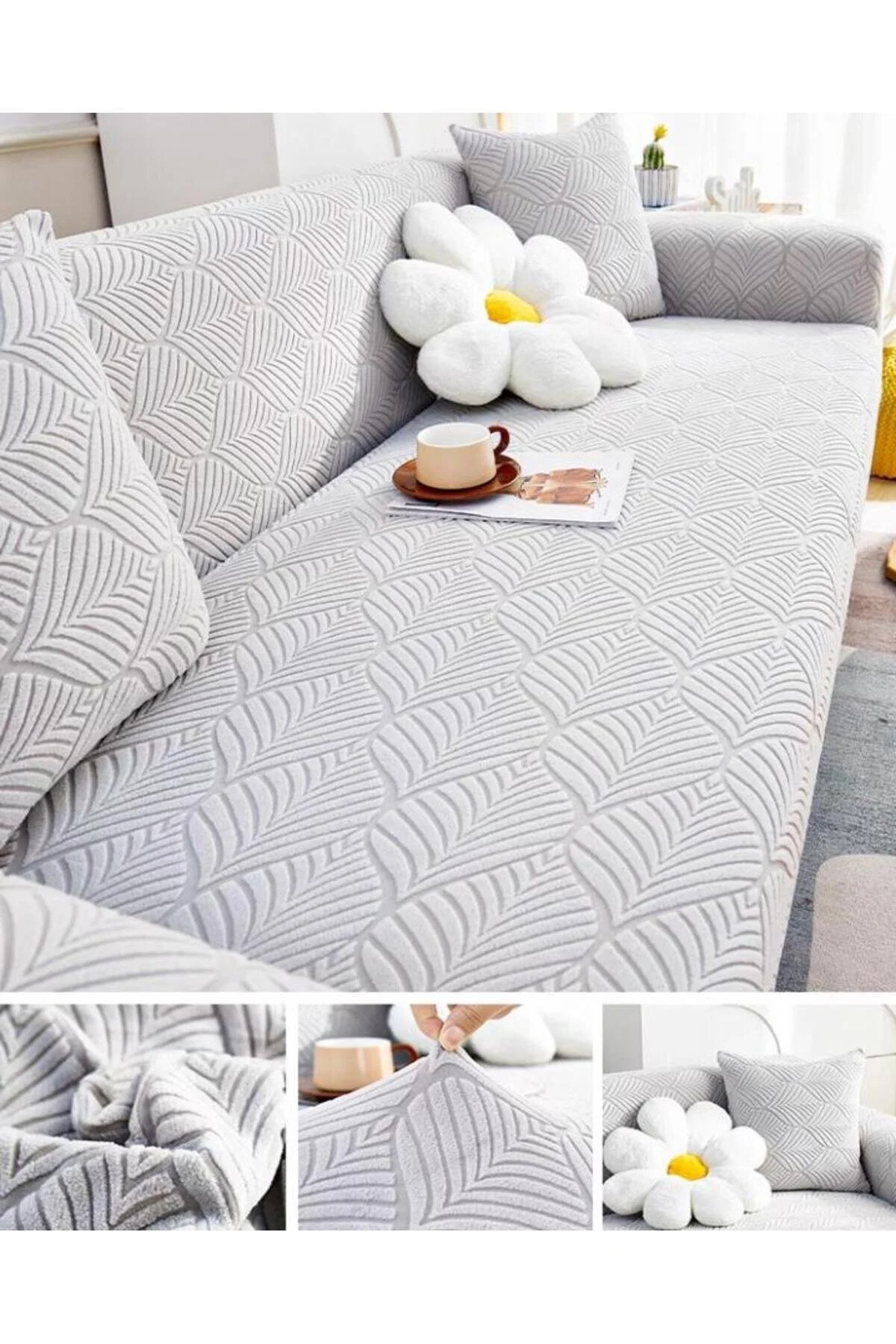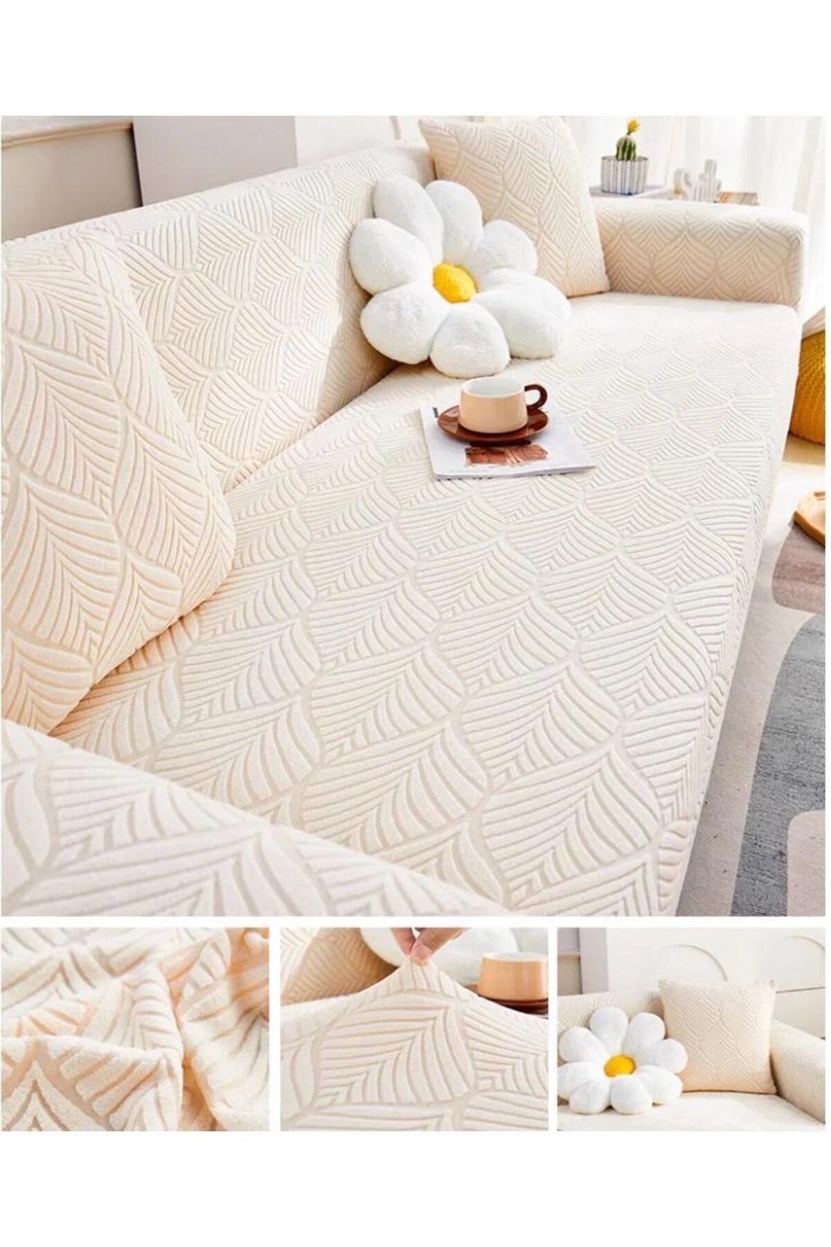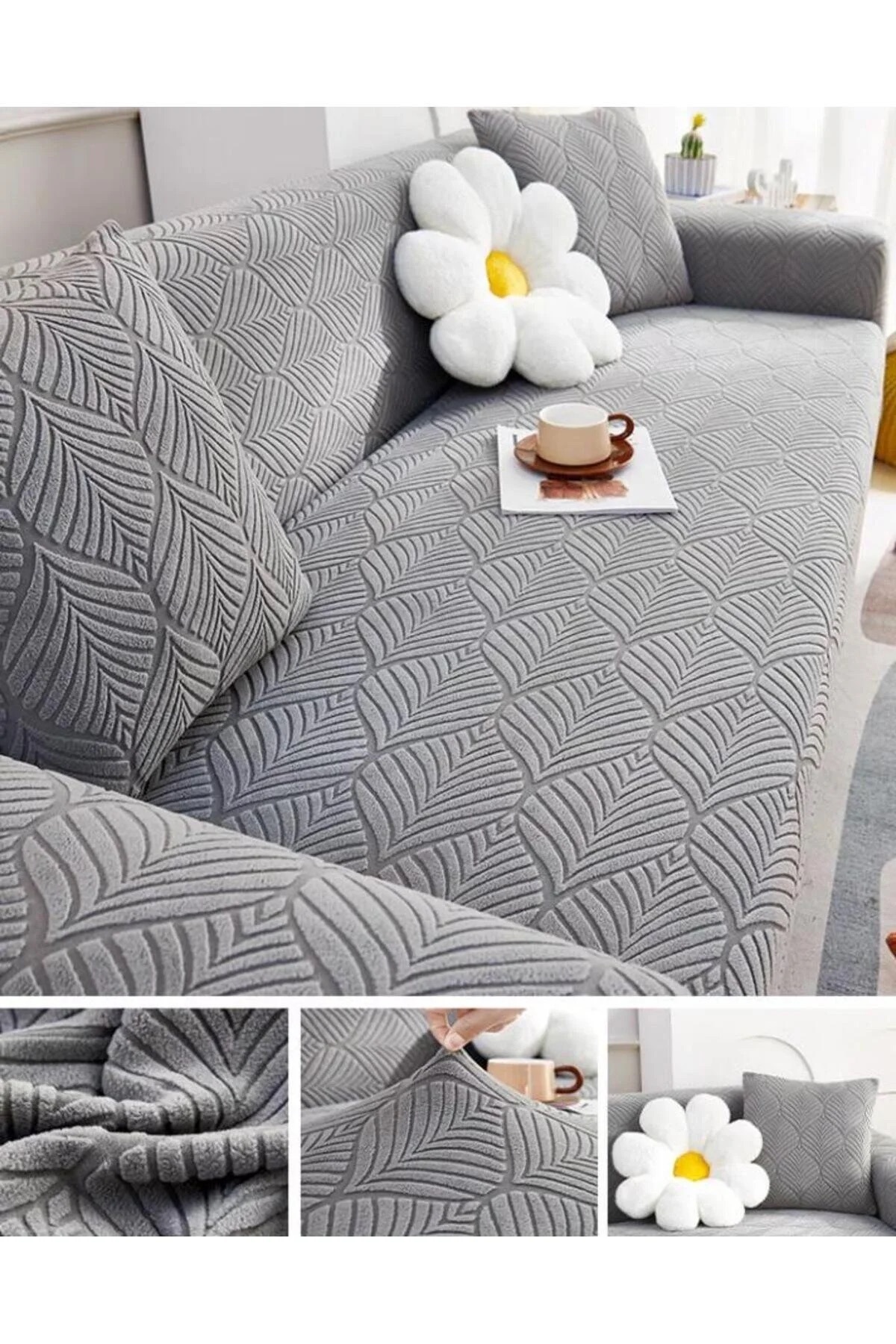 Koltuğunuzu şıklıkla koruyun – 3 Kişilik Lastikli Yaprak Desenli Koltuk Örtüsü Koltuğunuzun hem dekoratif yönünü ön plana çıkarın hem de günlük kullanımdan kaynaklanan çizik, leke ya da aşınmalara karşı koruyun.