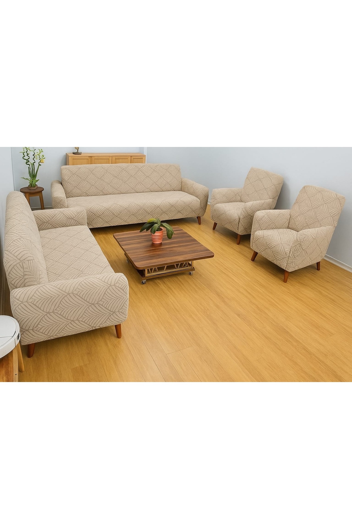 Yaprak desenli modern tarz, vizyon tonlarında renk — salonunuza sıcak ve stil sahibi bir hava katar.