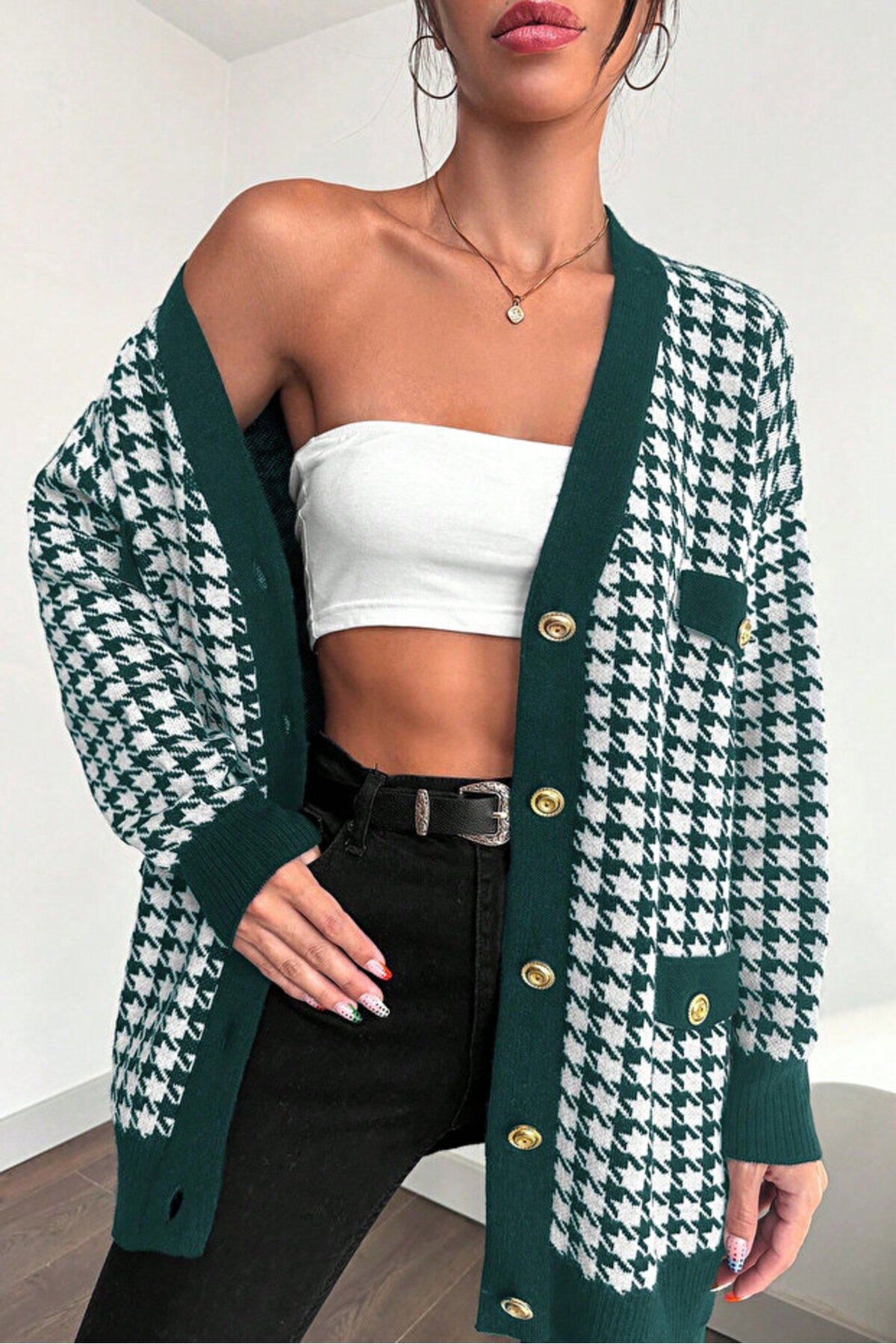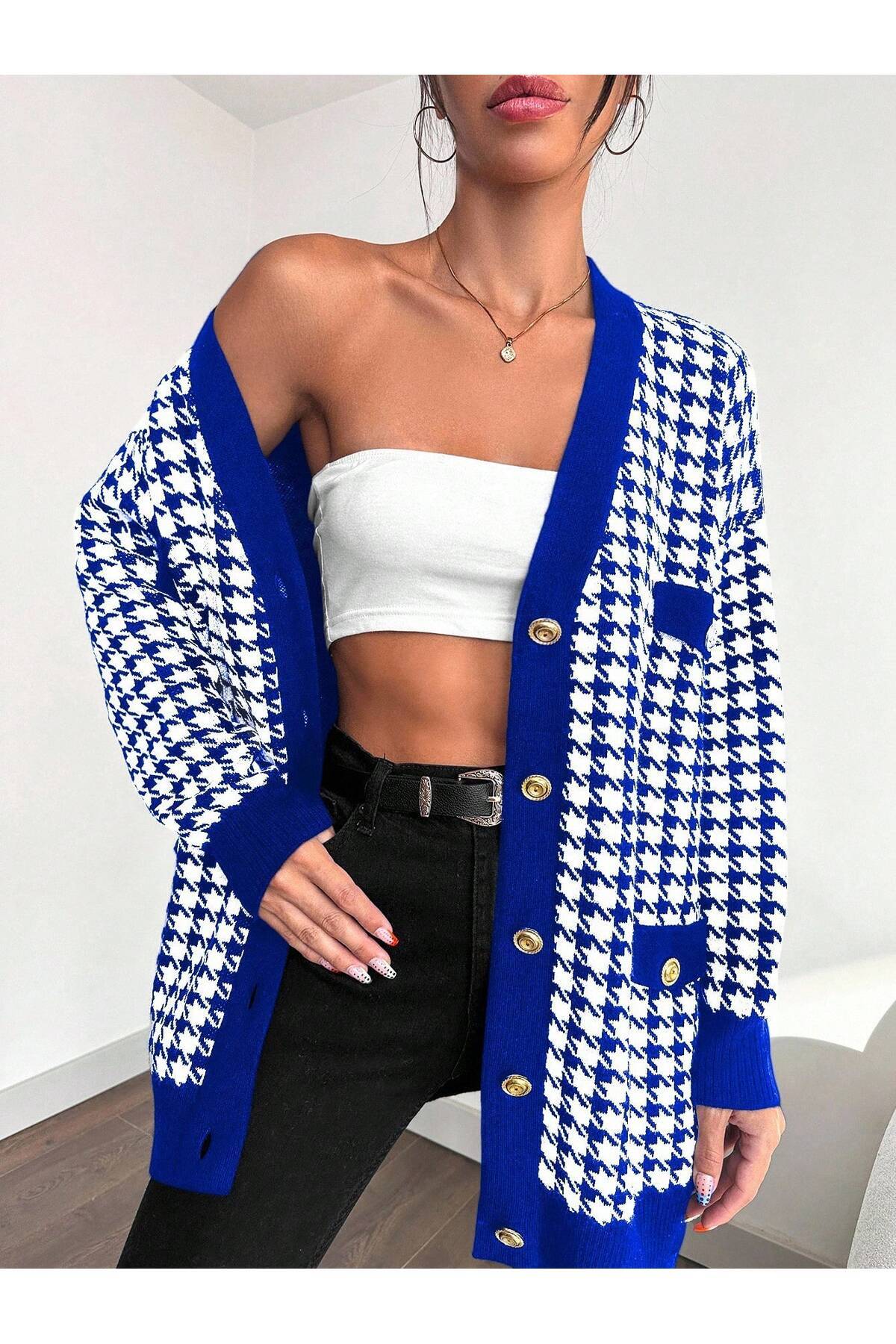 - Günlük kullanım için ideal, casual tarzıyla dikkat çeken kaz ayağı desenli şık triko ceket model hırka.