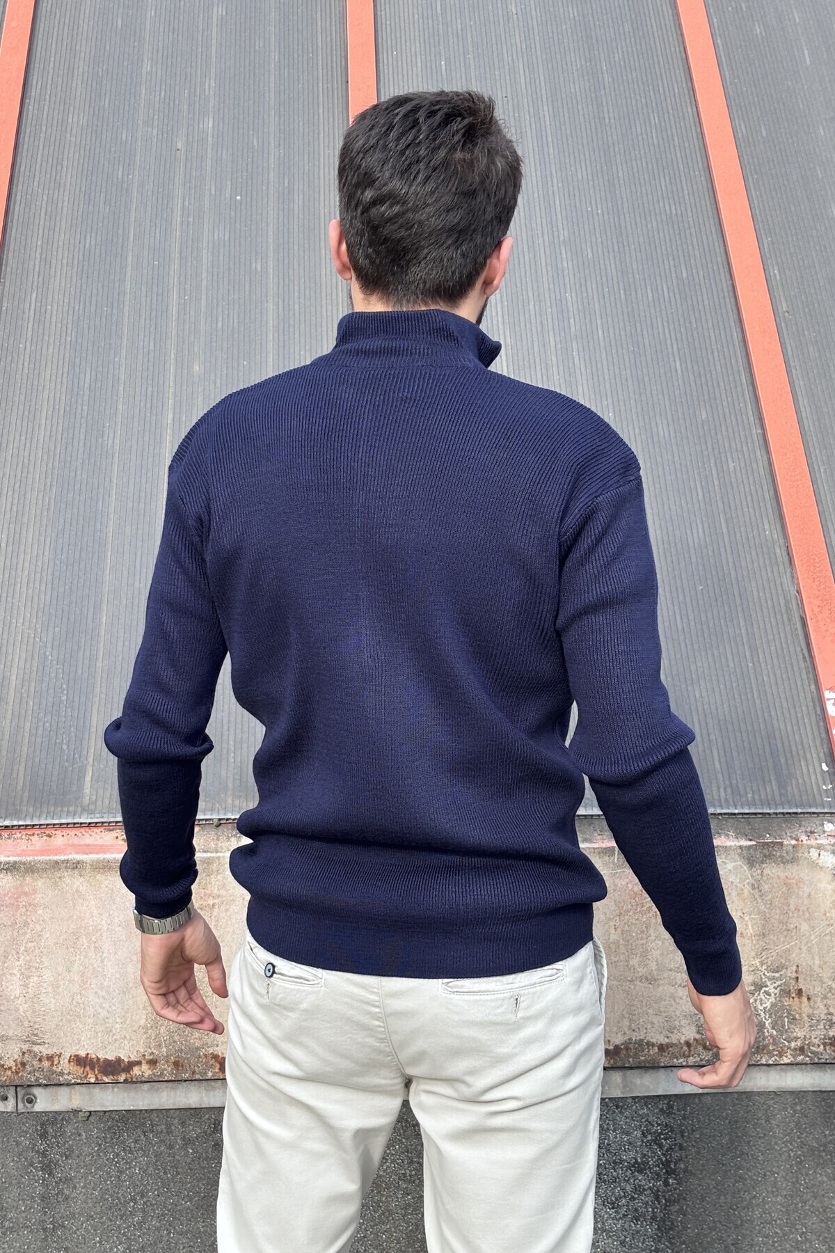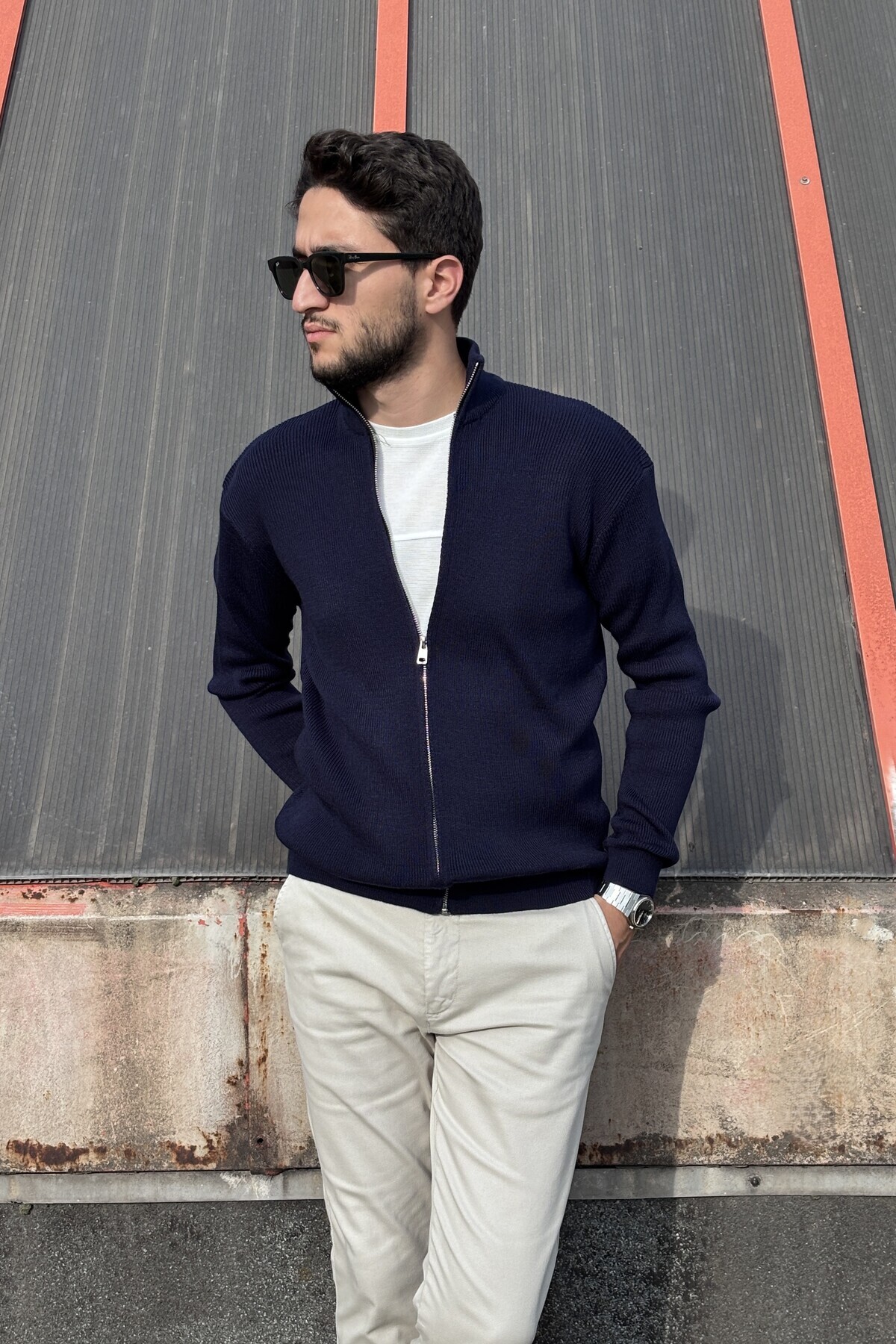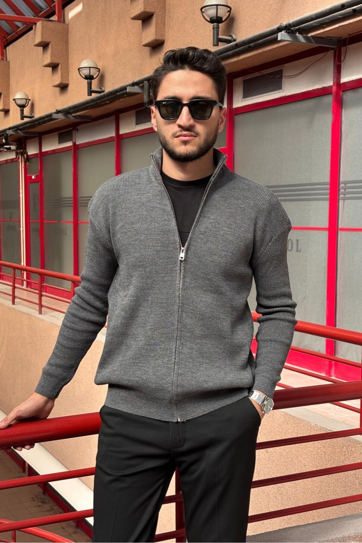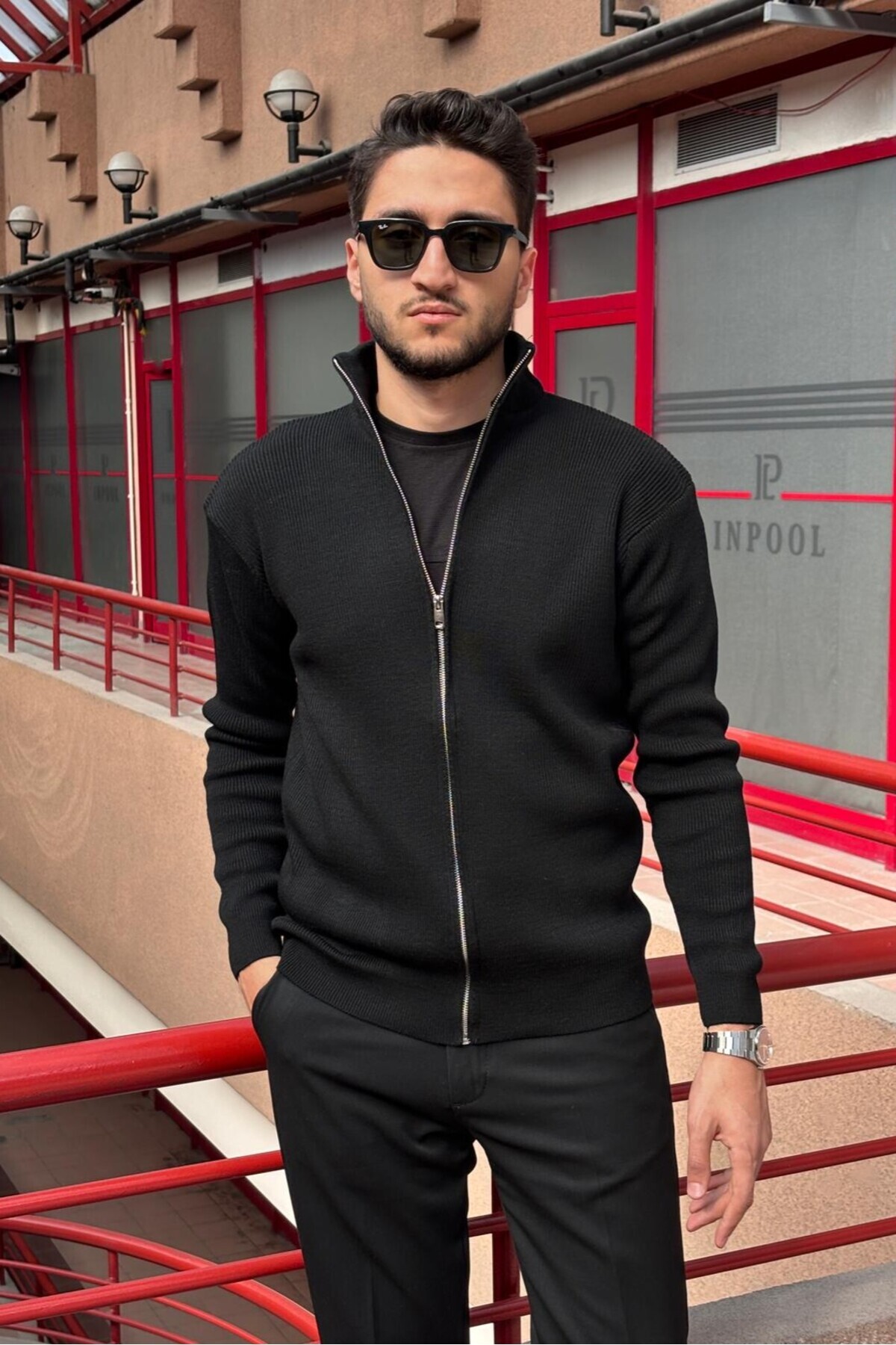 Erkek, Dik yaka, fermuarlı, esnek yapılı, fit görünüm kazak, hırka PLTK14. Mankenimiz 186 Cm boy ve 80 Kg ölçülerinde olup L beden giymektedir.