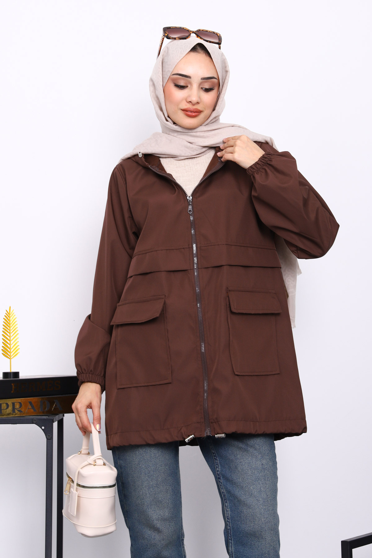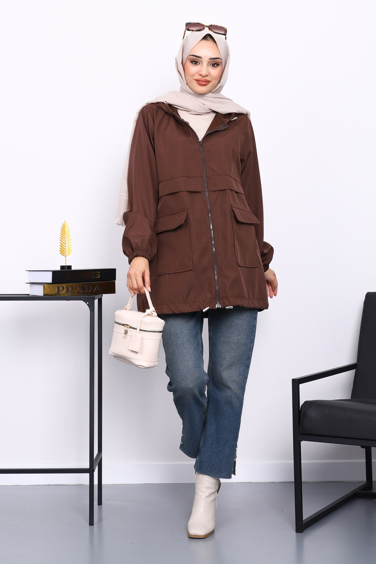 Kahverengi Kapüşonlu Fermuarlı Kısa Trenç