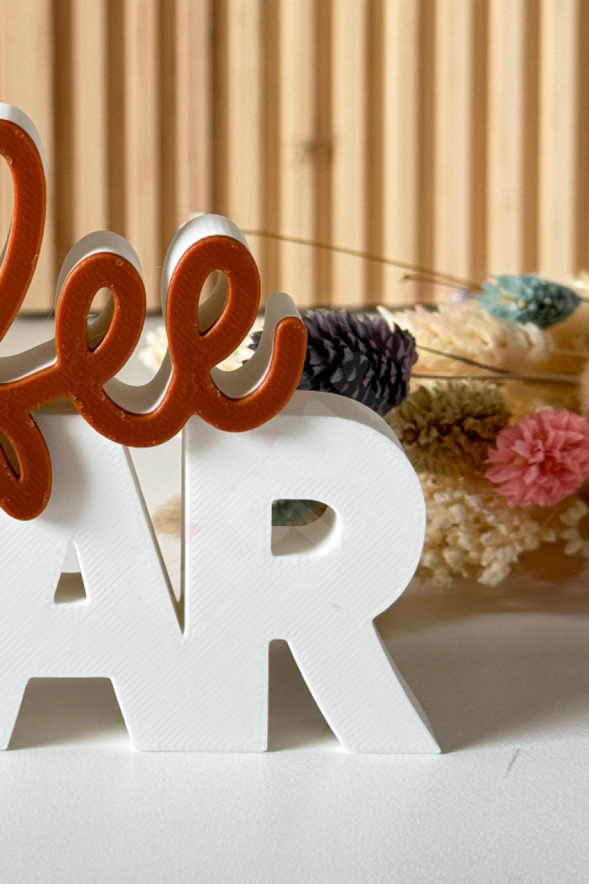3D yazıcı teknolojisiyle üretilen bu zarif obje, beyaz gövdesi ve kahverengi yazı detayıyla modern ve şık bir görünüm sunar.