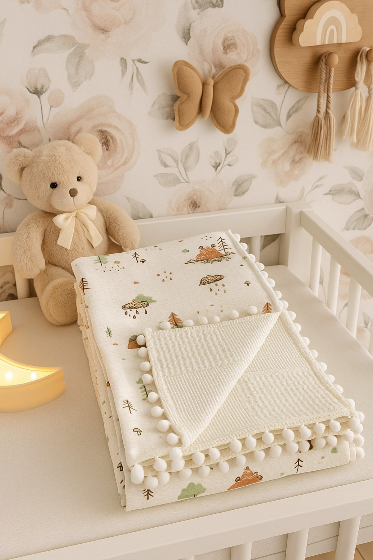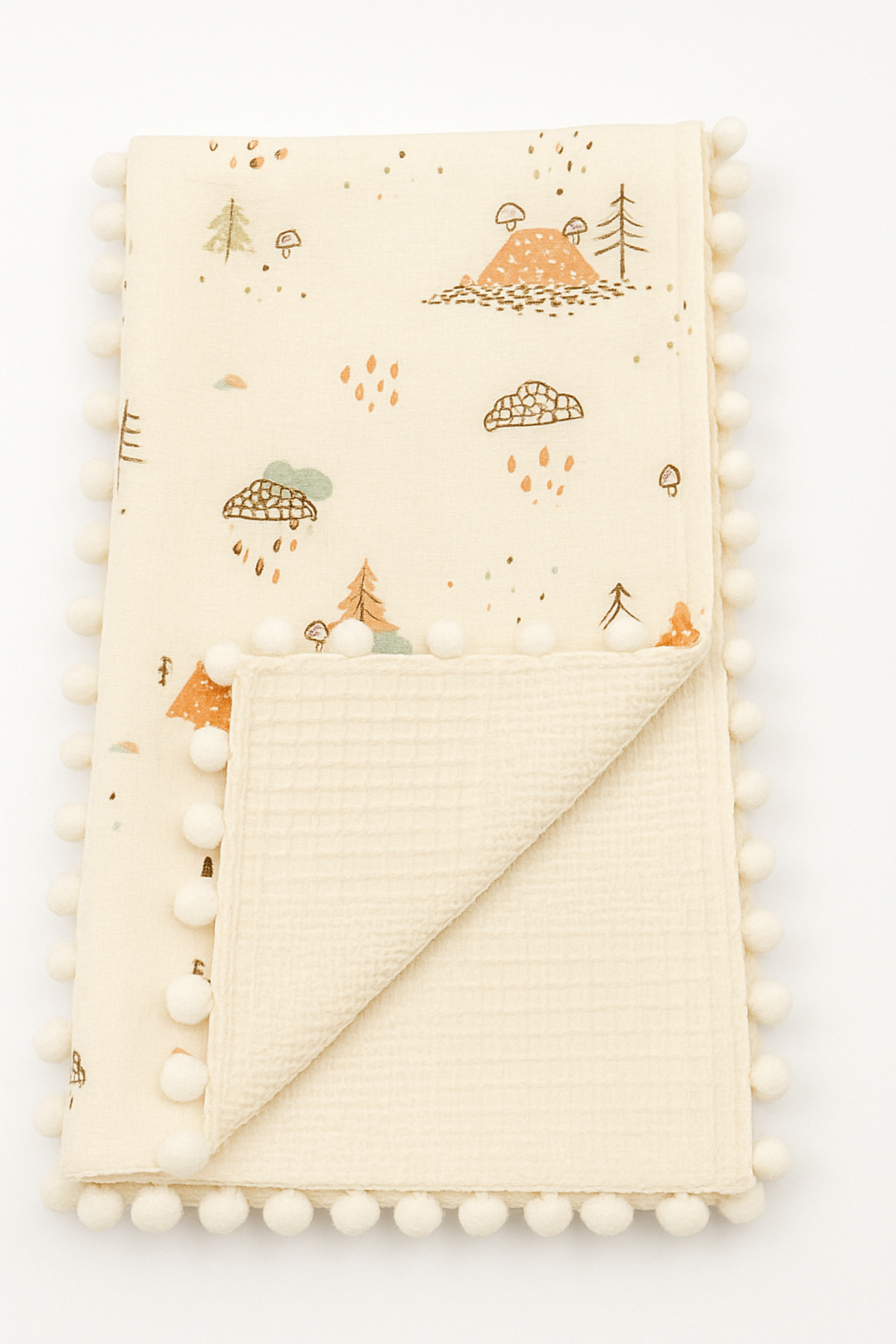 Doğal müslin kumaştan üretilen, hafif ve nefes alabilir yapısıyla bebeğinizin cildine dost bir battaniye! kullanımı kolaydır.