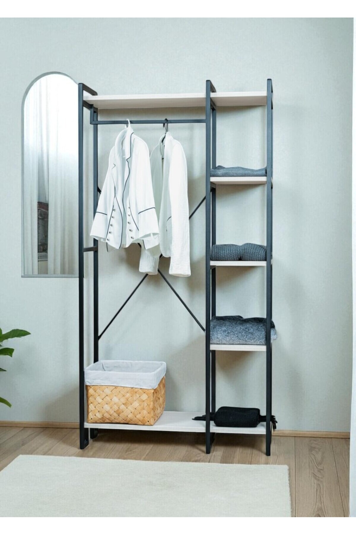 DEKORATİF METAL AYAKLI BEYAZ AHŞAP RAFLI ELBİSE ASKILIĞI AYAKKABILIK PORTATİF PORTMANTO GARDIROP