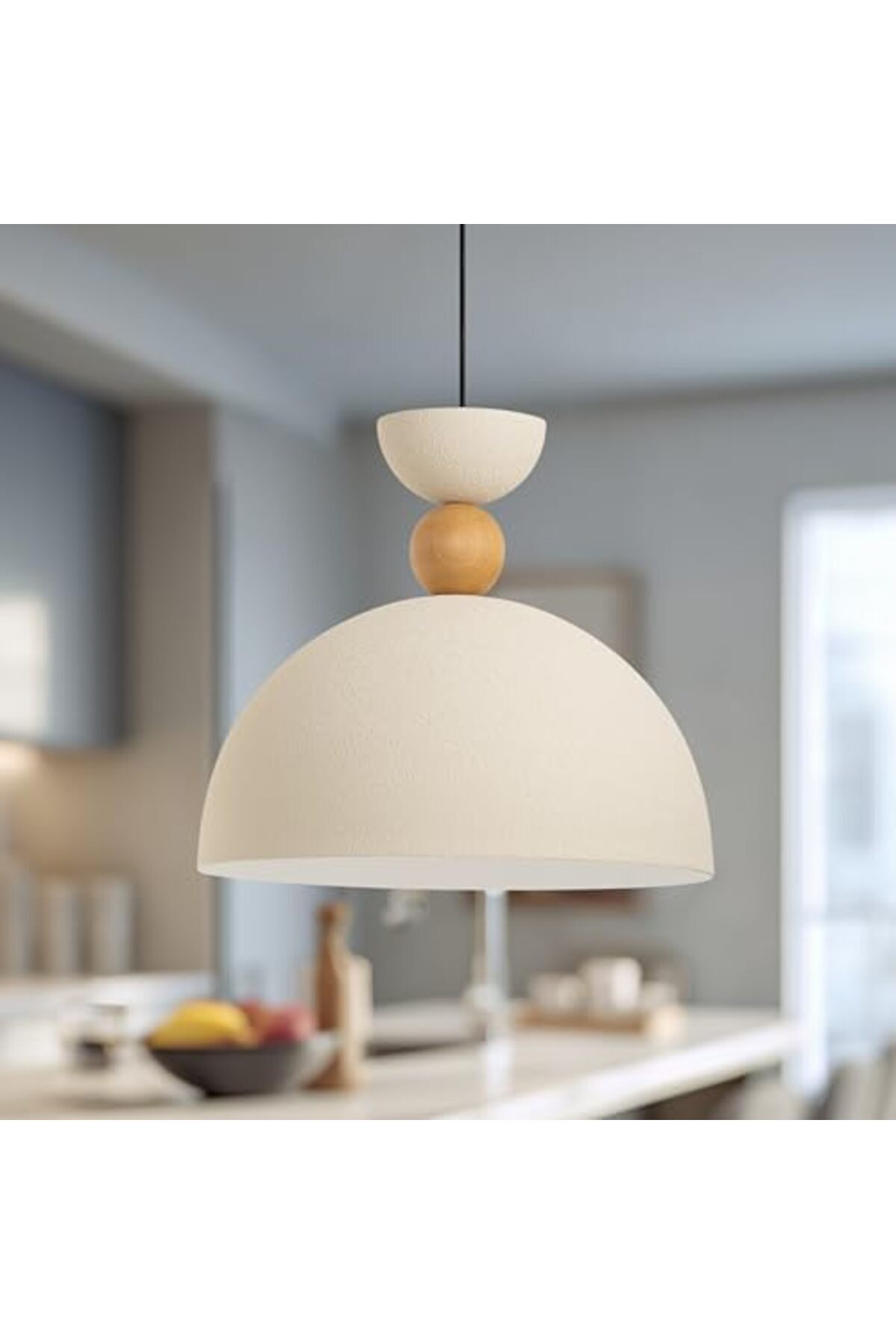 Ahşap Boncuk Detaylı Tekli Sarkıt Aydınlatma, Metal Sıvama, Ev, Ofis, Cafe, Restoran Avizeleri, E27 Duy (Dokulu Krem)
