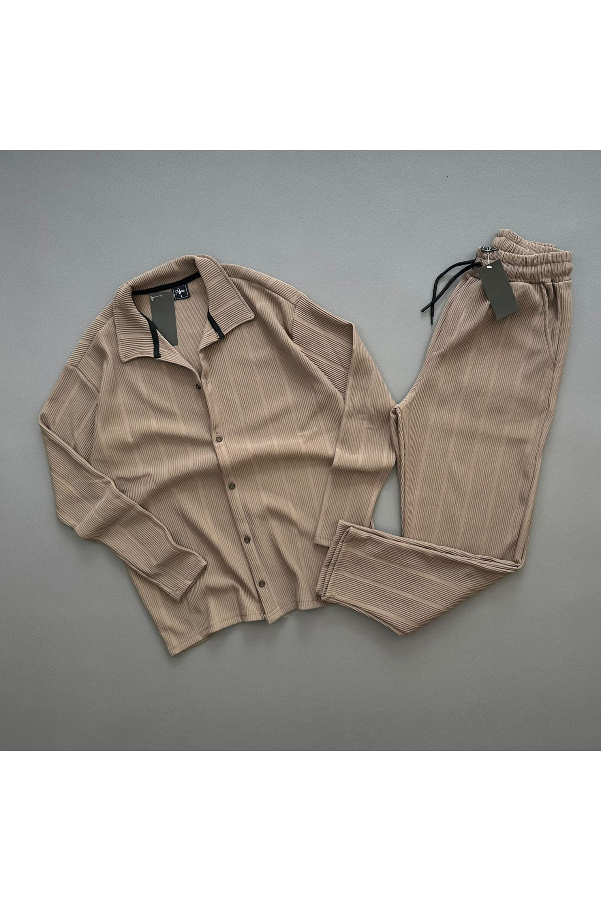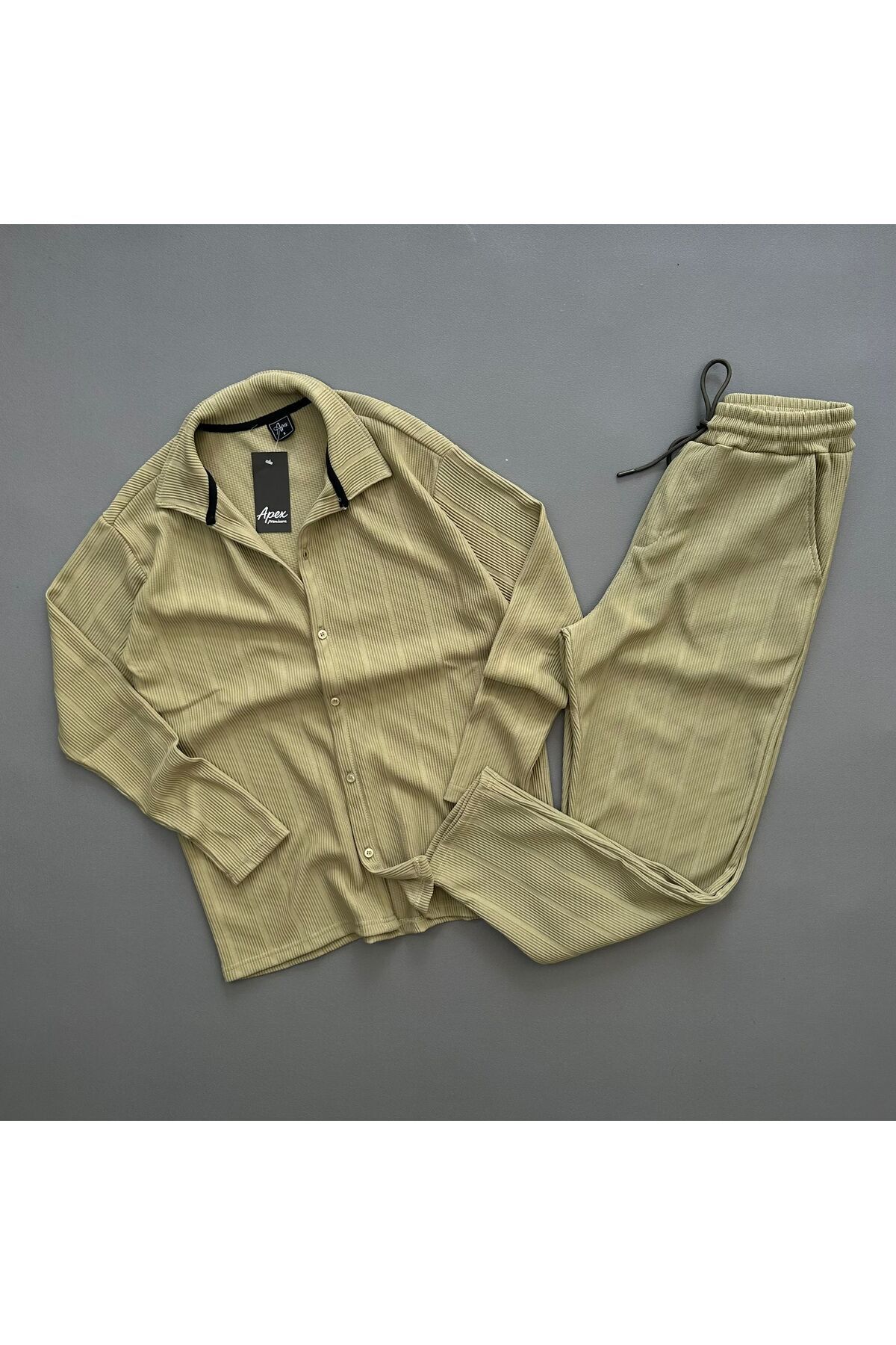 - İki parçadan oluşan takım, gömlek ve pantolon kombinasyonuyla pratik bir çözüm sunar.