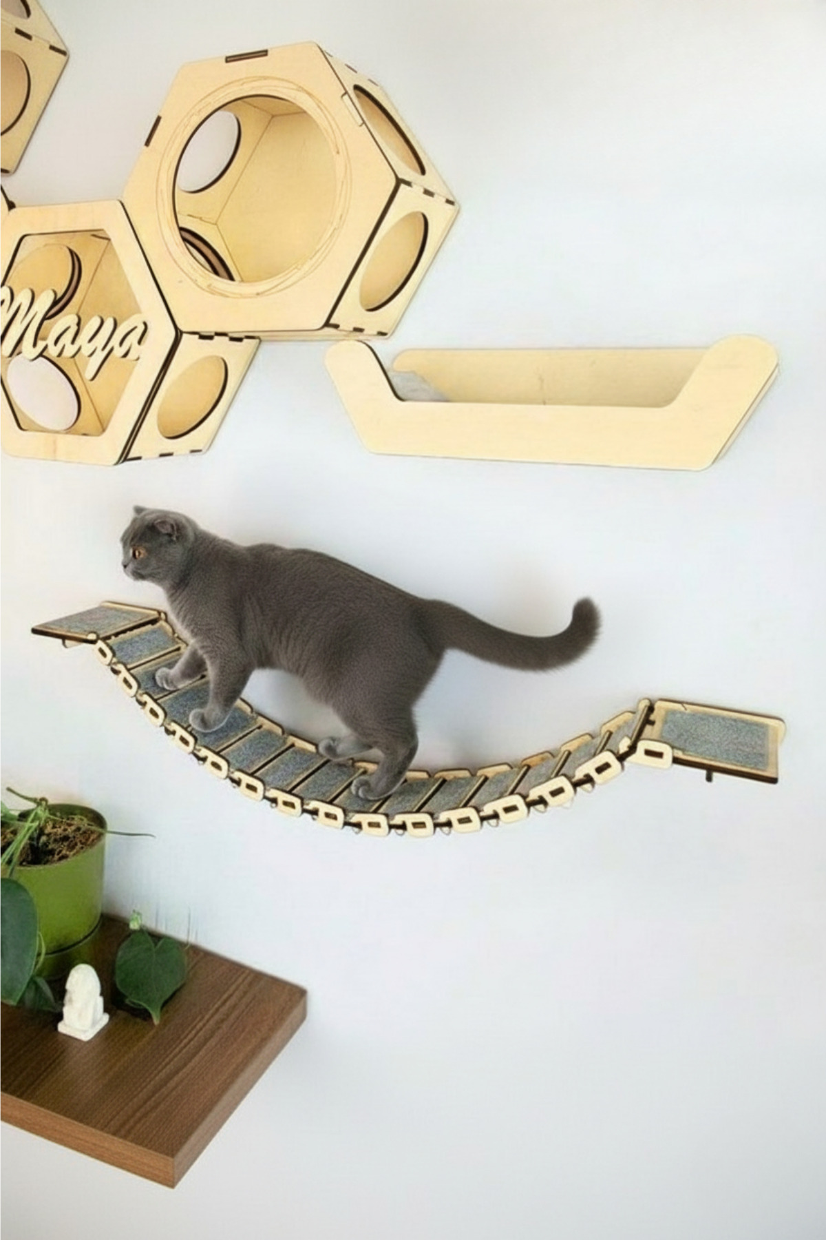 Genişlik: 120 cm, Derinlik: 19 cm Kedinizin eğlenceli anlar yaşaması ve rahatça tırmanabilmesi için tasarlanmış şık duvara monte kedi köprüsü.