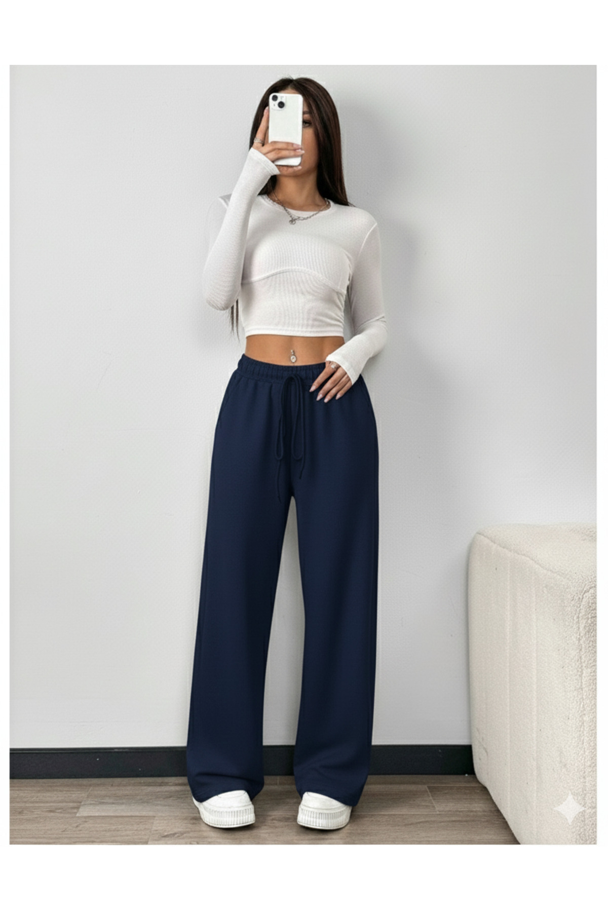 - Geniş paça tasarımı ile modern ve rahat bir siluet oluşturur.