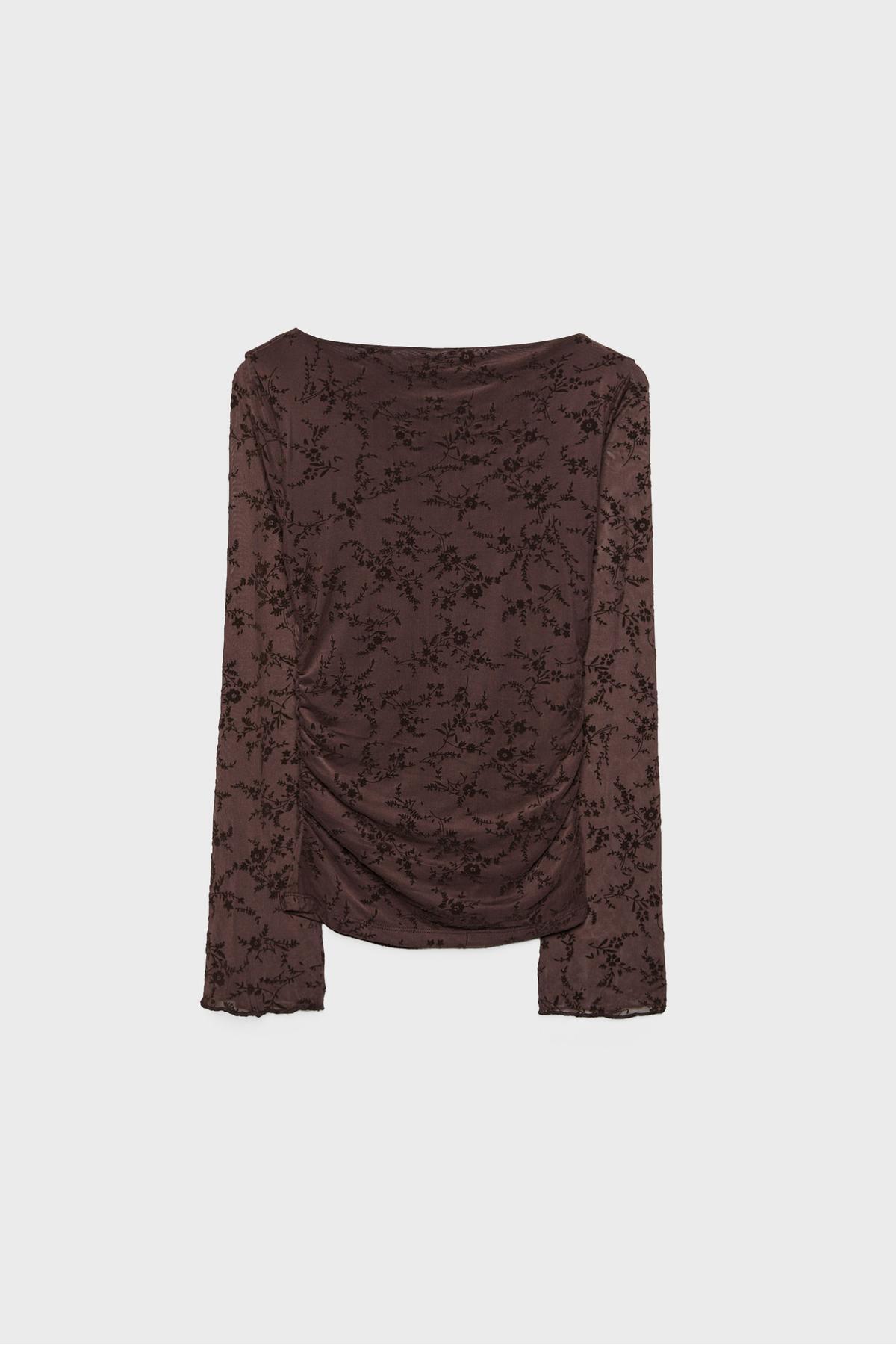Flok baskılı çiçek aplikeli tül kumaştan üretilmiş yarı transparan tişört.