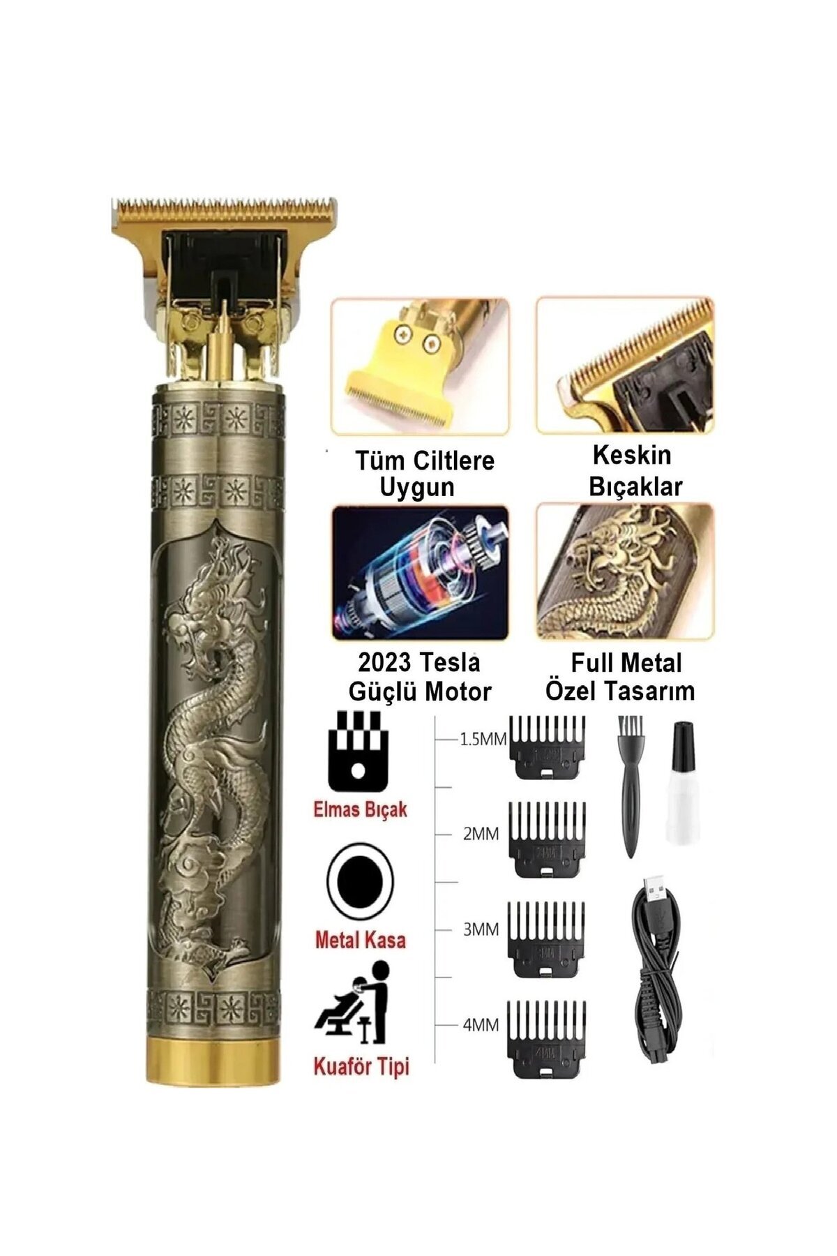 Metal Gövde ve Ejderha İşlemeli DetaylarDayanıklı metal gövdesiyle Profesyonel Tıraş Makinesi, uzun ömürlü bir kullanım sağlar ve şık bir görünüm sunar.