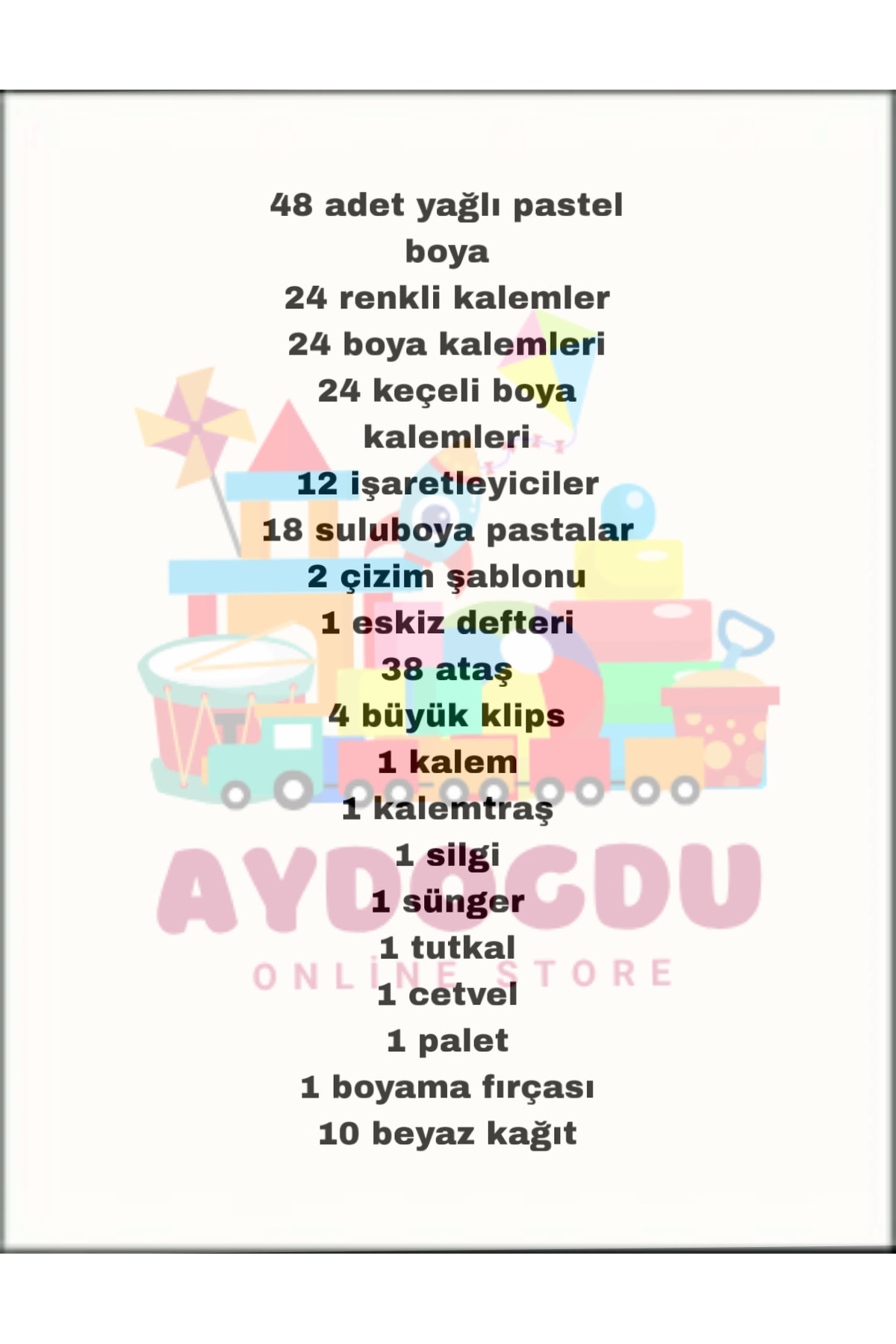 48 adet yağlı pastel boya24 renkli kalemler24 boya kalemleri24 keçeli boya kalemleri12 işaretleyiciler18 suluboya pastalar2 çizim şablonu1 eskiz defteri38 ataş4 büyük klips1 kalem1 kalemtraş1 silgi1 sünger1 tutkal1 cetvel1 palet1 boyama fırçası10 beyaz kağıt