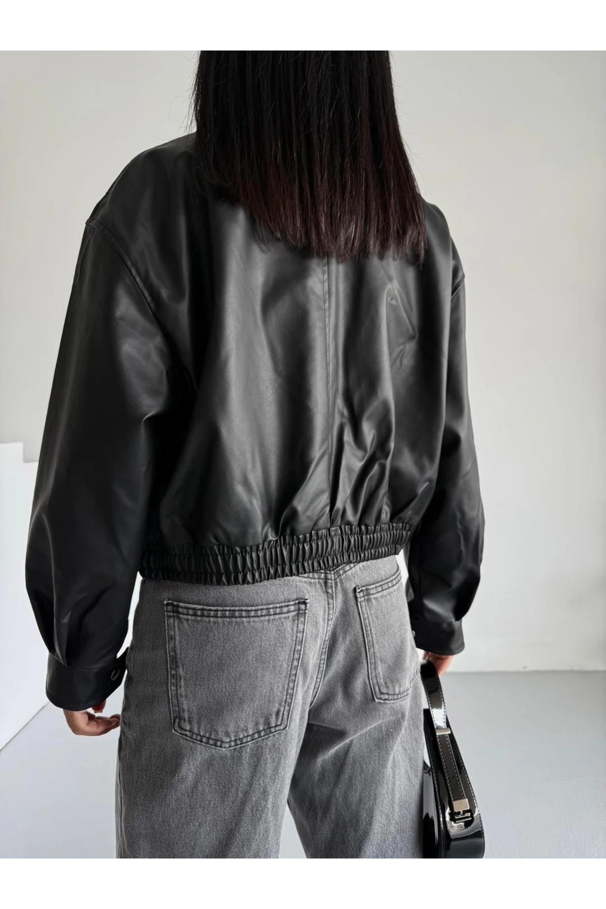- Şık ve modern bir görünüm için siyah renkli, düz desenli suni deri bomber ceket.