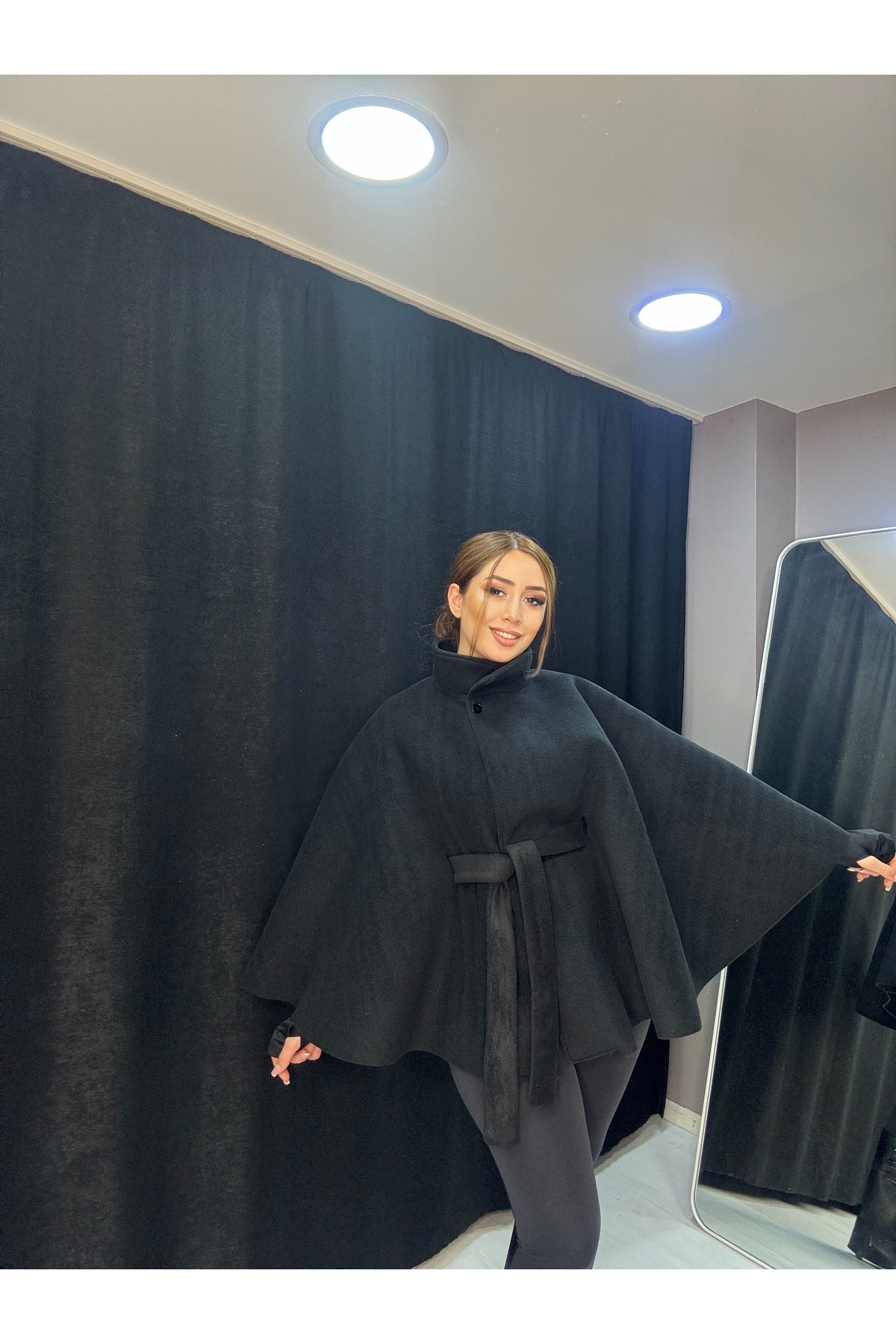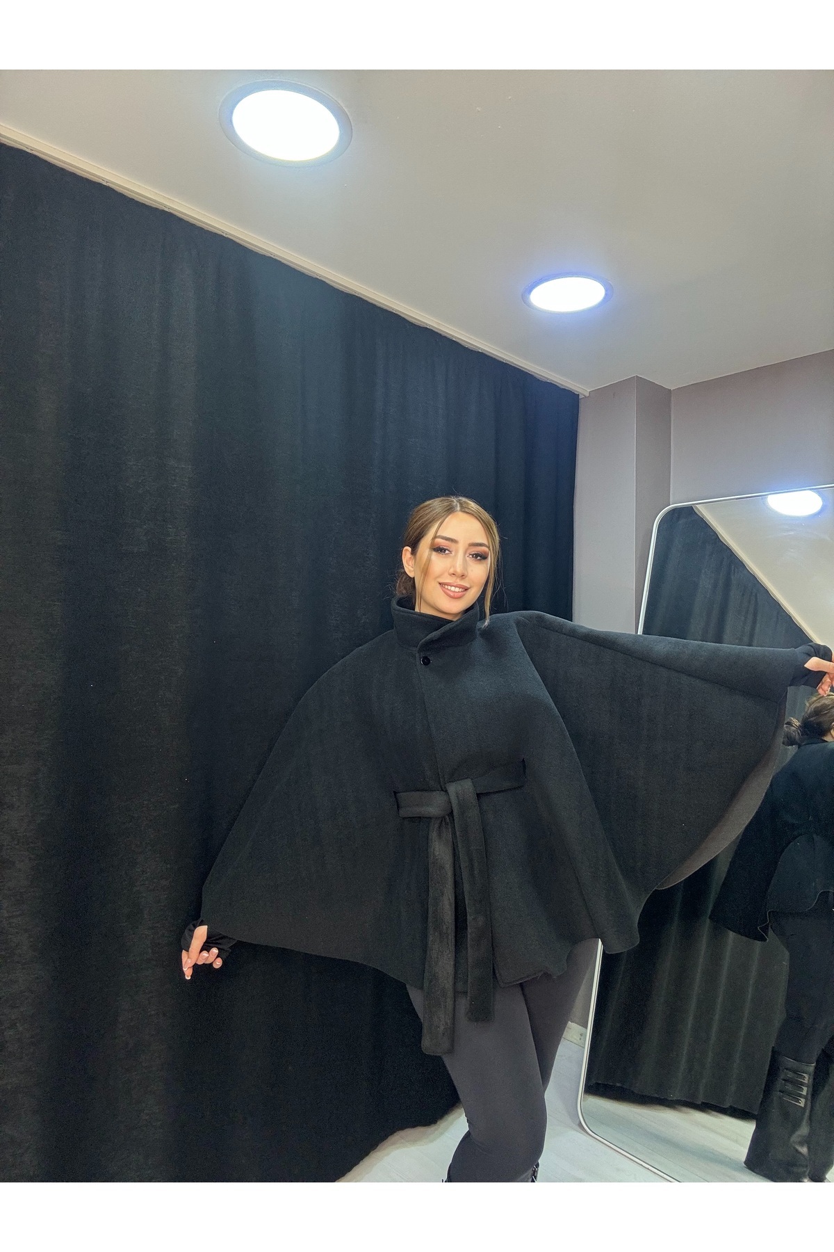 BOL DİK YAKA KUŞAK KEMER DETAY TASARIM MARKA MUADİL YARASA KOL İTHAL KAŞE KUMAŞ DÜĞMELİ PANÇO CEKET KABAN STANDART BEDEN