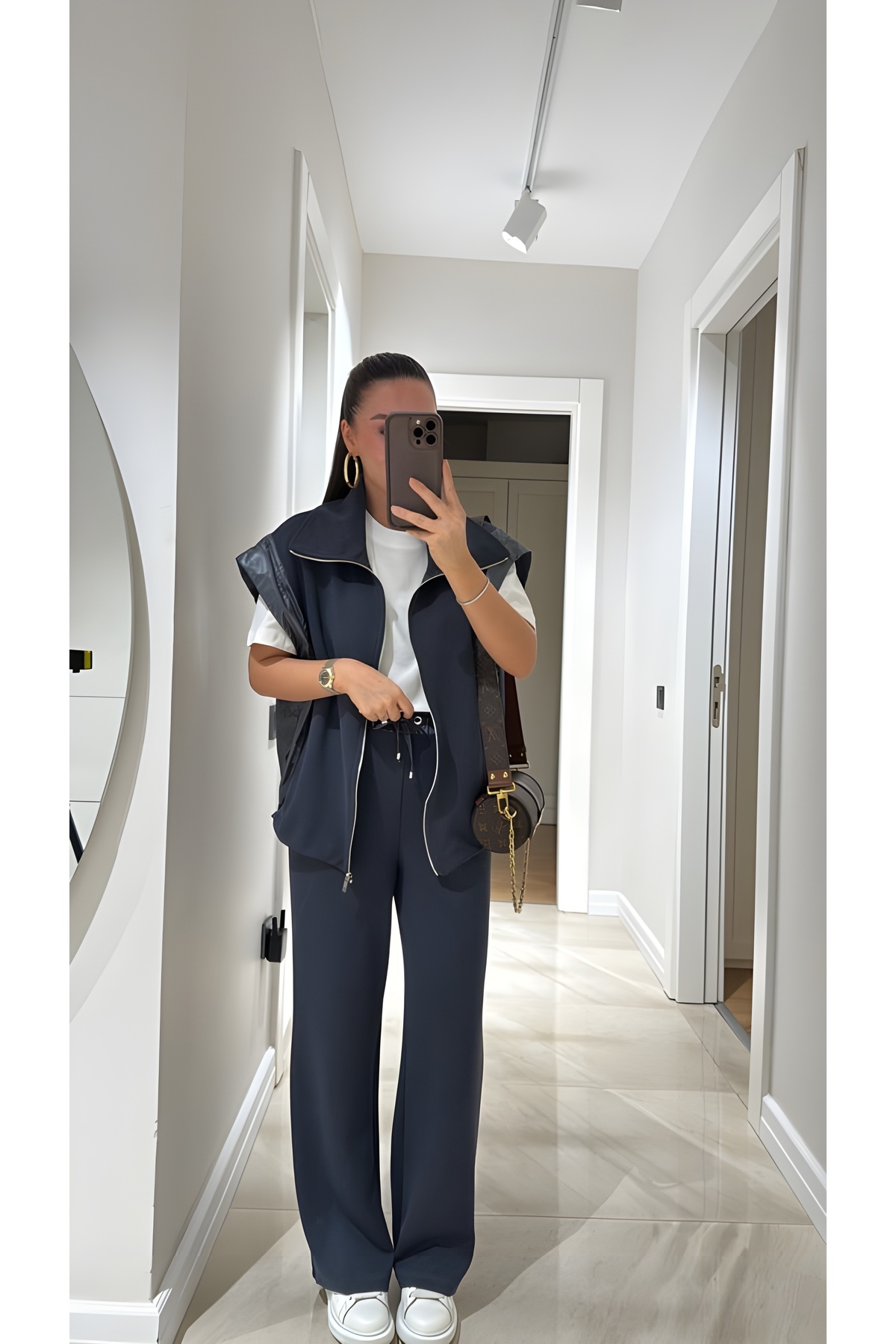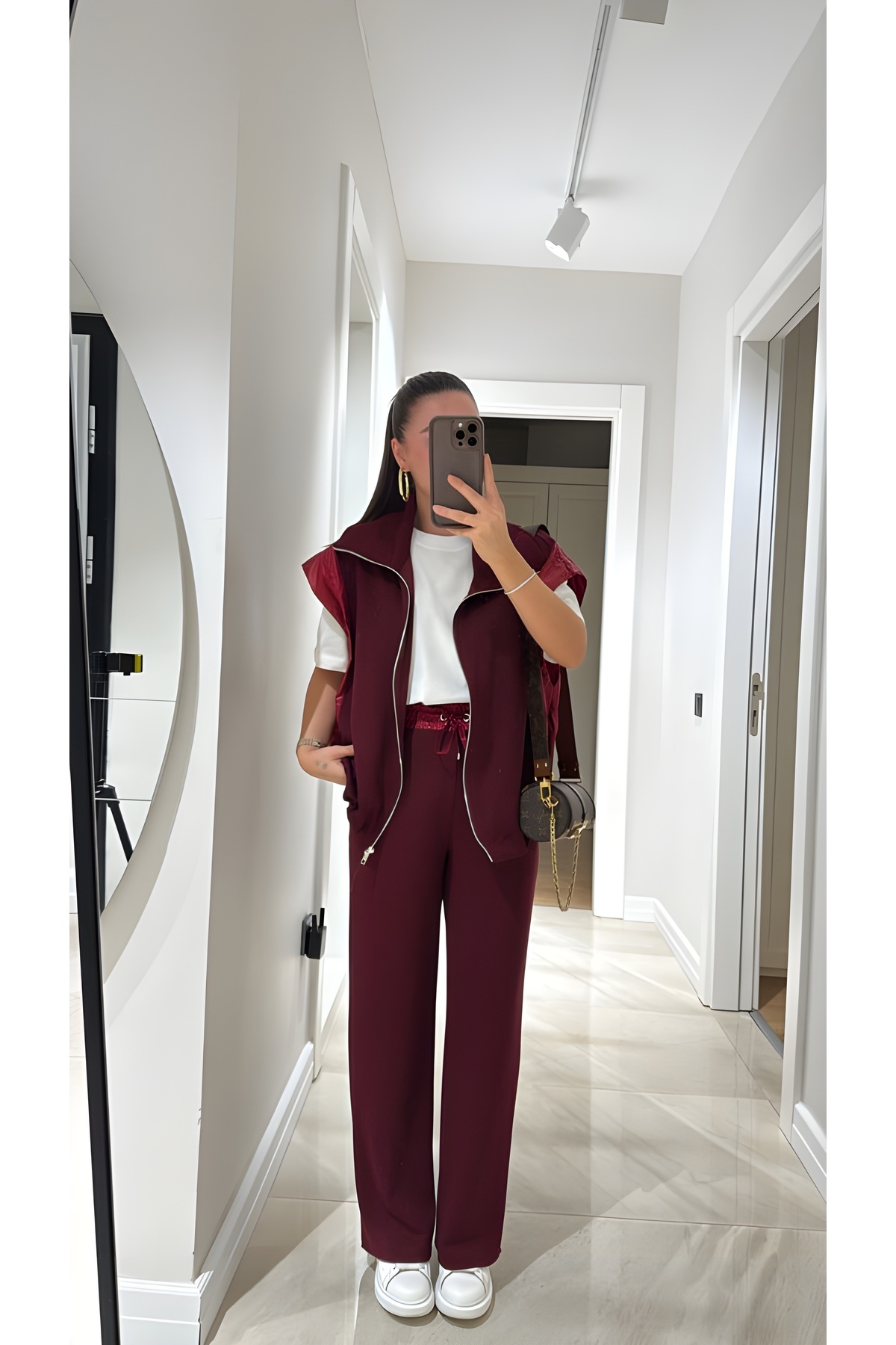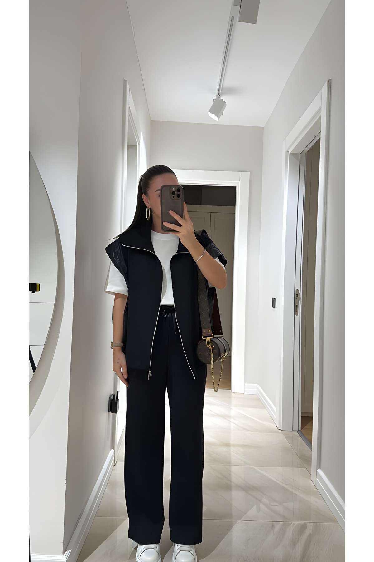 Kadın Yelek Pantolon Takım Bel Lastikli Fermuarlı Yelek Şık Alt-Üst Takım