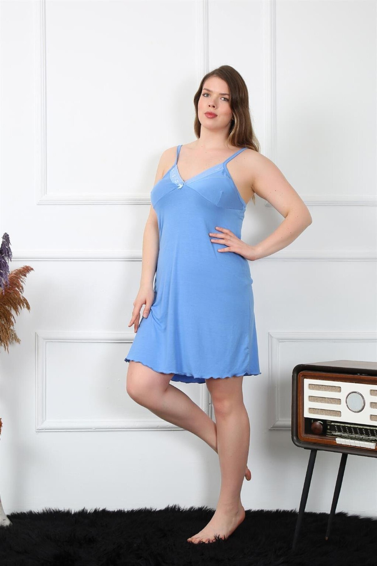 Kadın Pamuklu Mavi İp Askılı Büyük Beden Gecelik