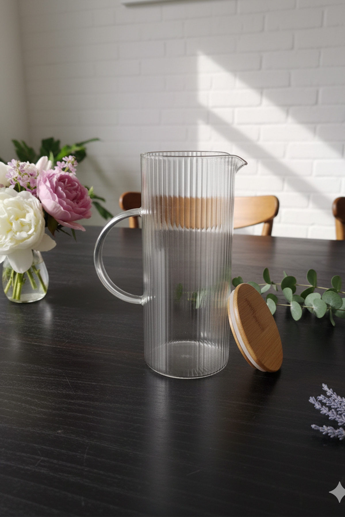 Serine Borosilikat Cam Sürahi – Bambu Kapaklı Isıya Dayanıklı Şeffaf Sürahi 1500 ml
