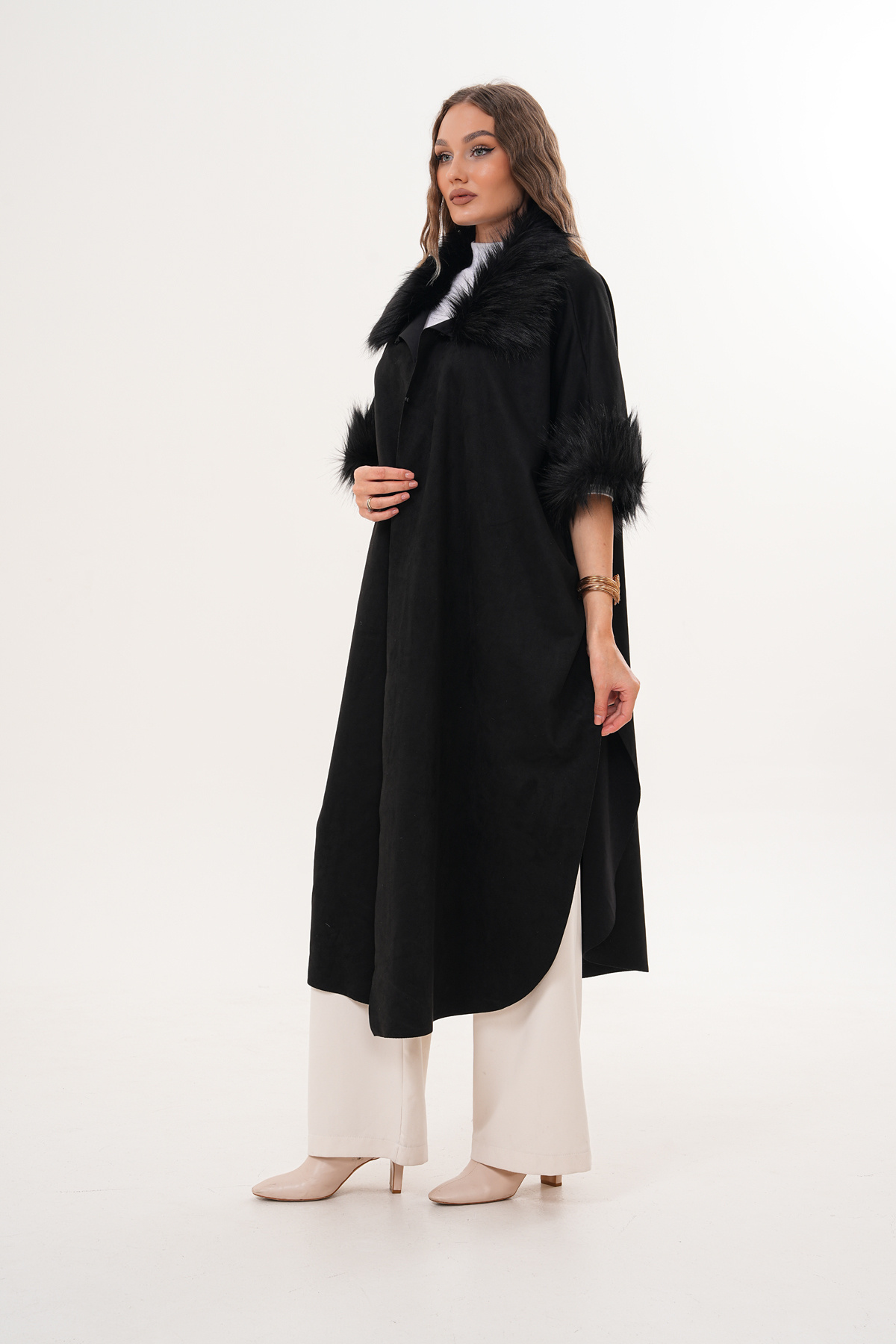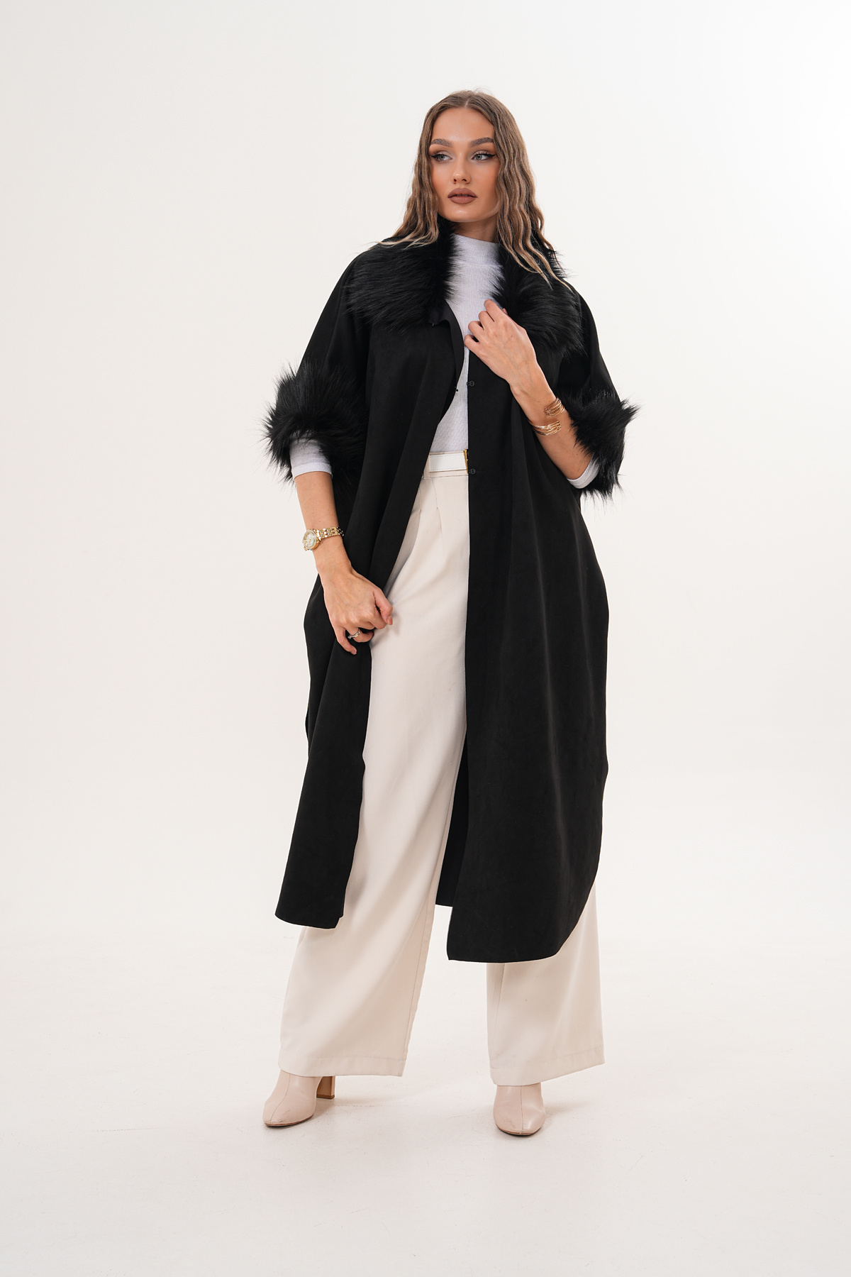 - Uzun kesimi ile kış aylarında sıcak tutan ve şık bir görünüm sunan süet panço.