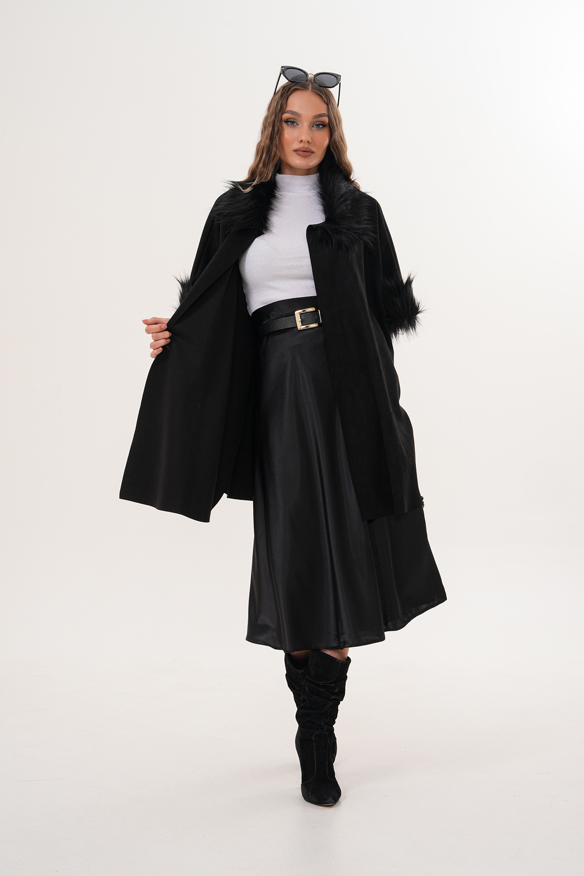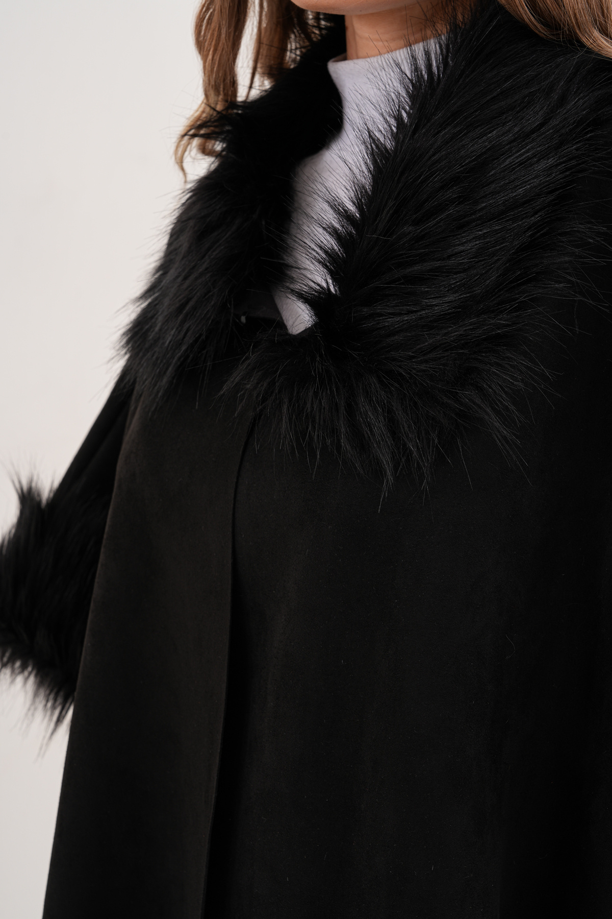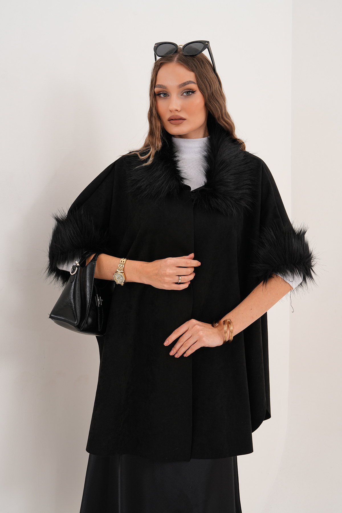 - Kış mevsiminde sıcak tutan ve şık bir görünüm sunan süet kısa panço.