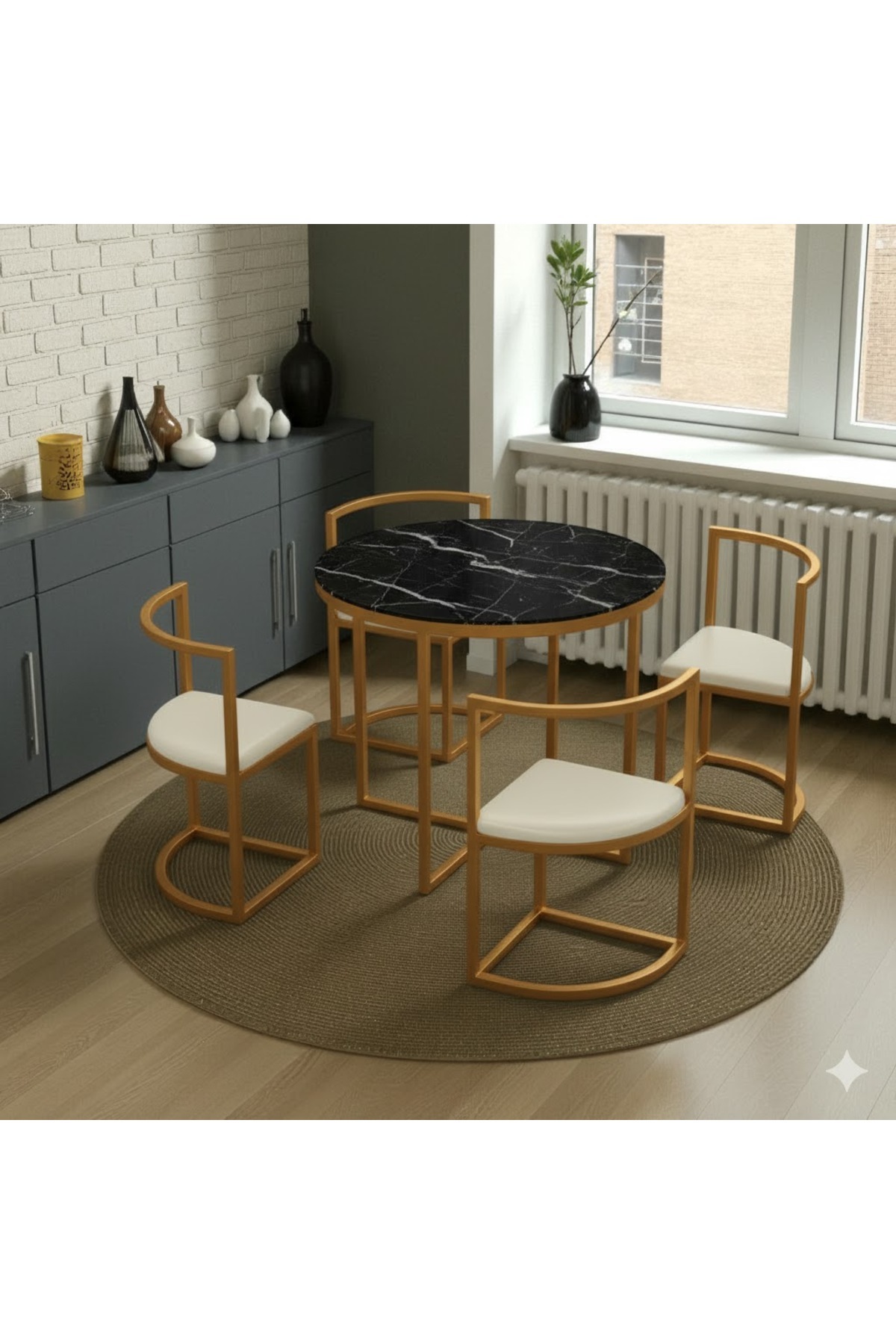 - 90 x 90 cm boyutlarındaki yuvarlak masa, modern tasarımıyla dikkat çeker ve mekanınıza şık bir görünüm katar.