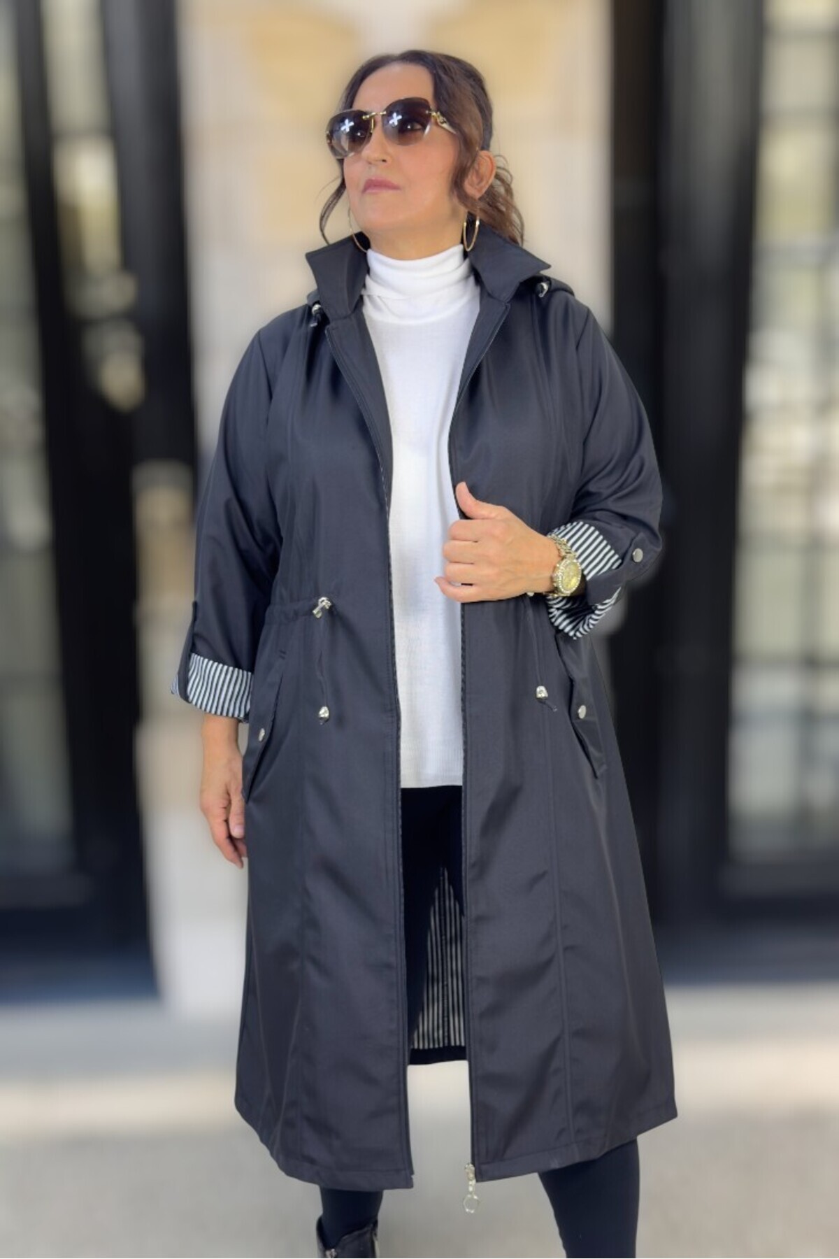 ÇIKARTILABİLİR KAPŞONLU KATLANABİLİR KOL DETAY BONDED KUMAŞ EKSTRA BÜYÜK BEDEN TRENÇKOT.