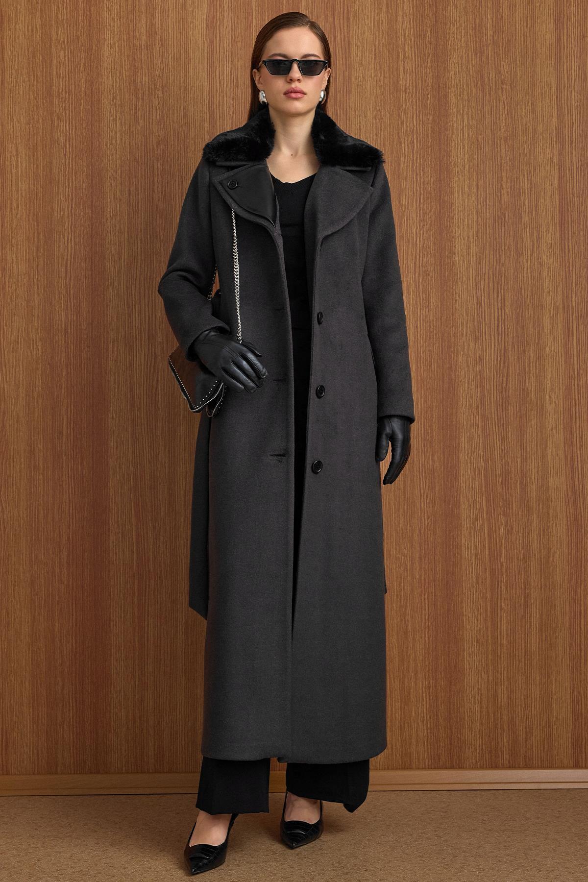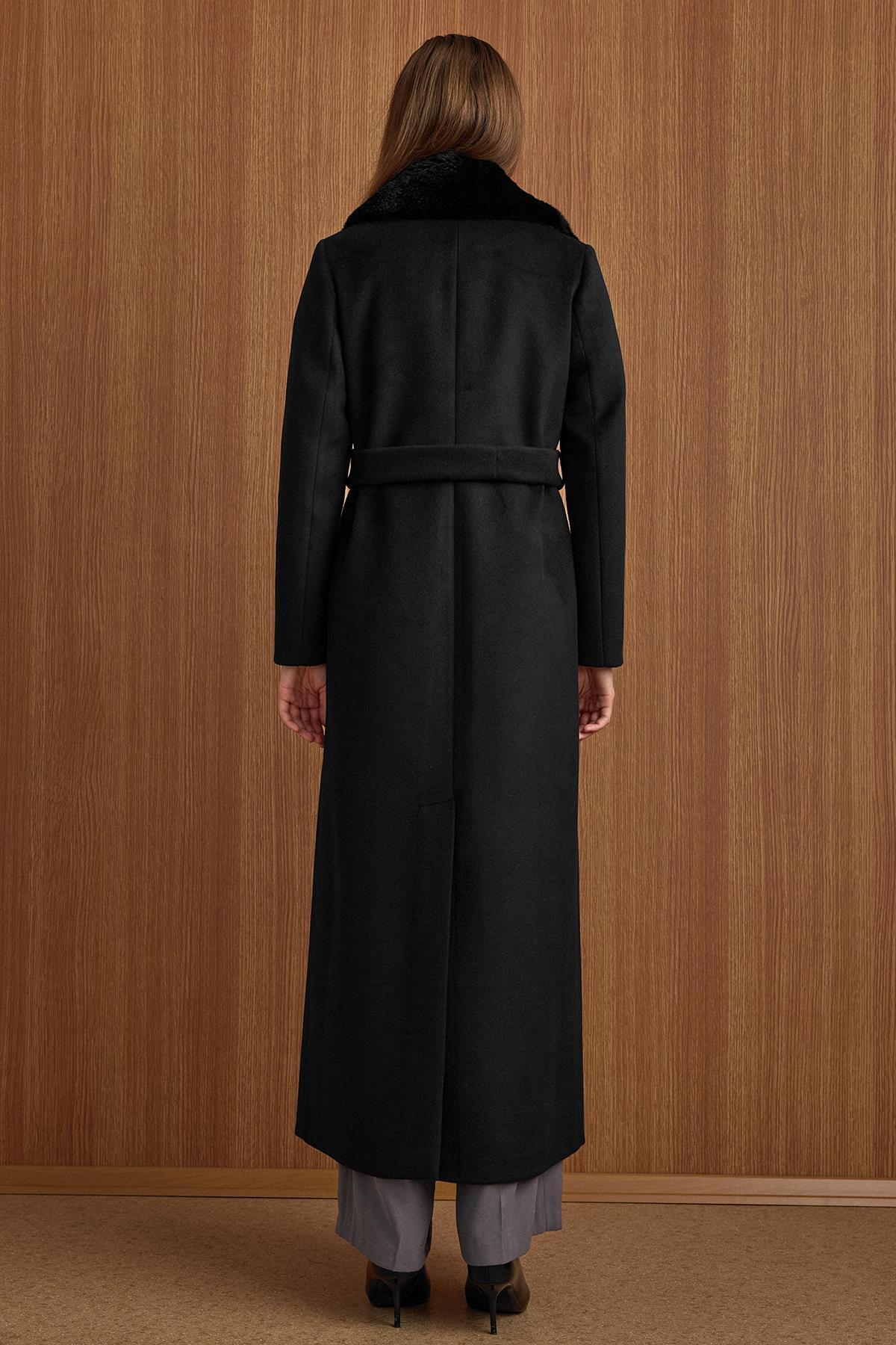 Çıkabilir Kürklü Deri Garnili Premium Kumaş Manto SİYAH 3153