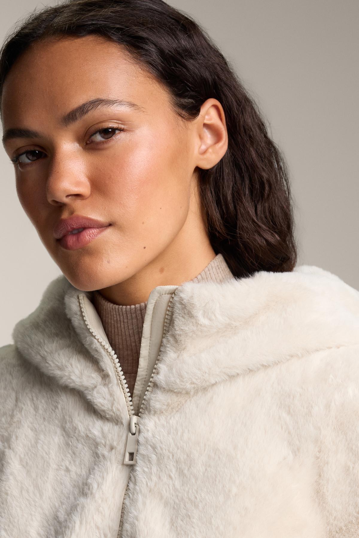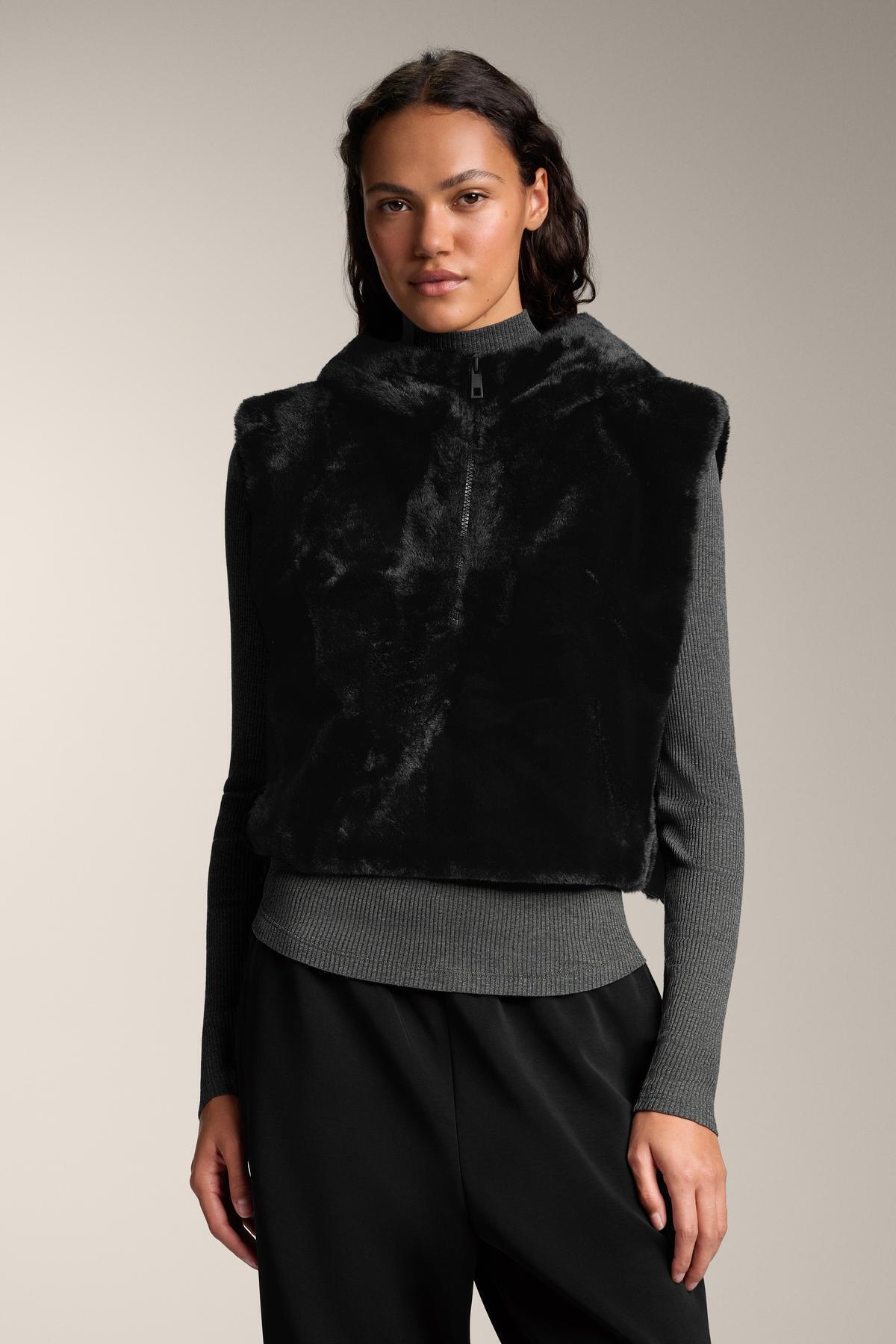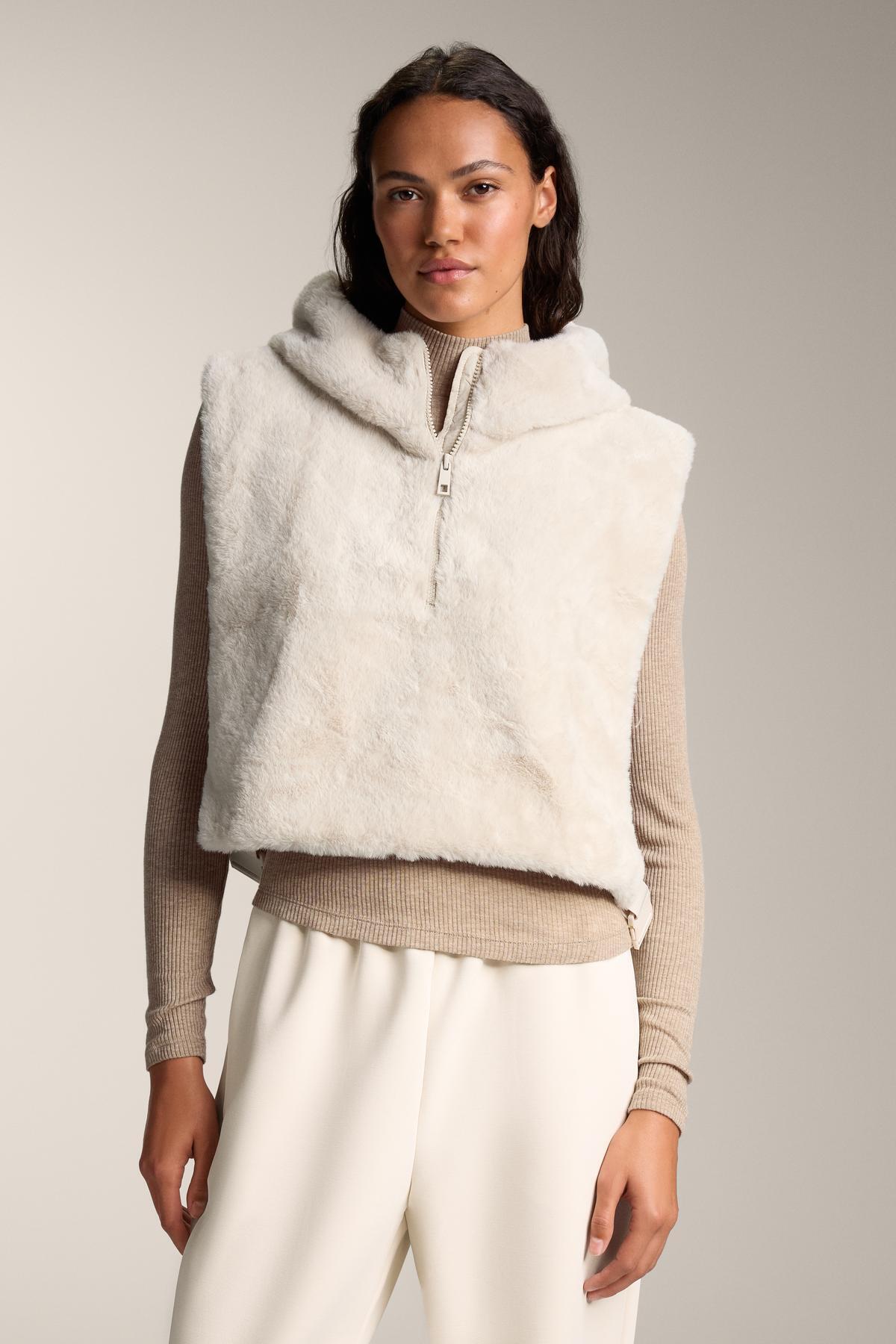 Ayarlanabilir kapüşonlu suni kürklü yelek.