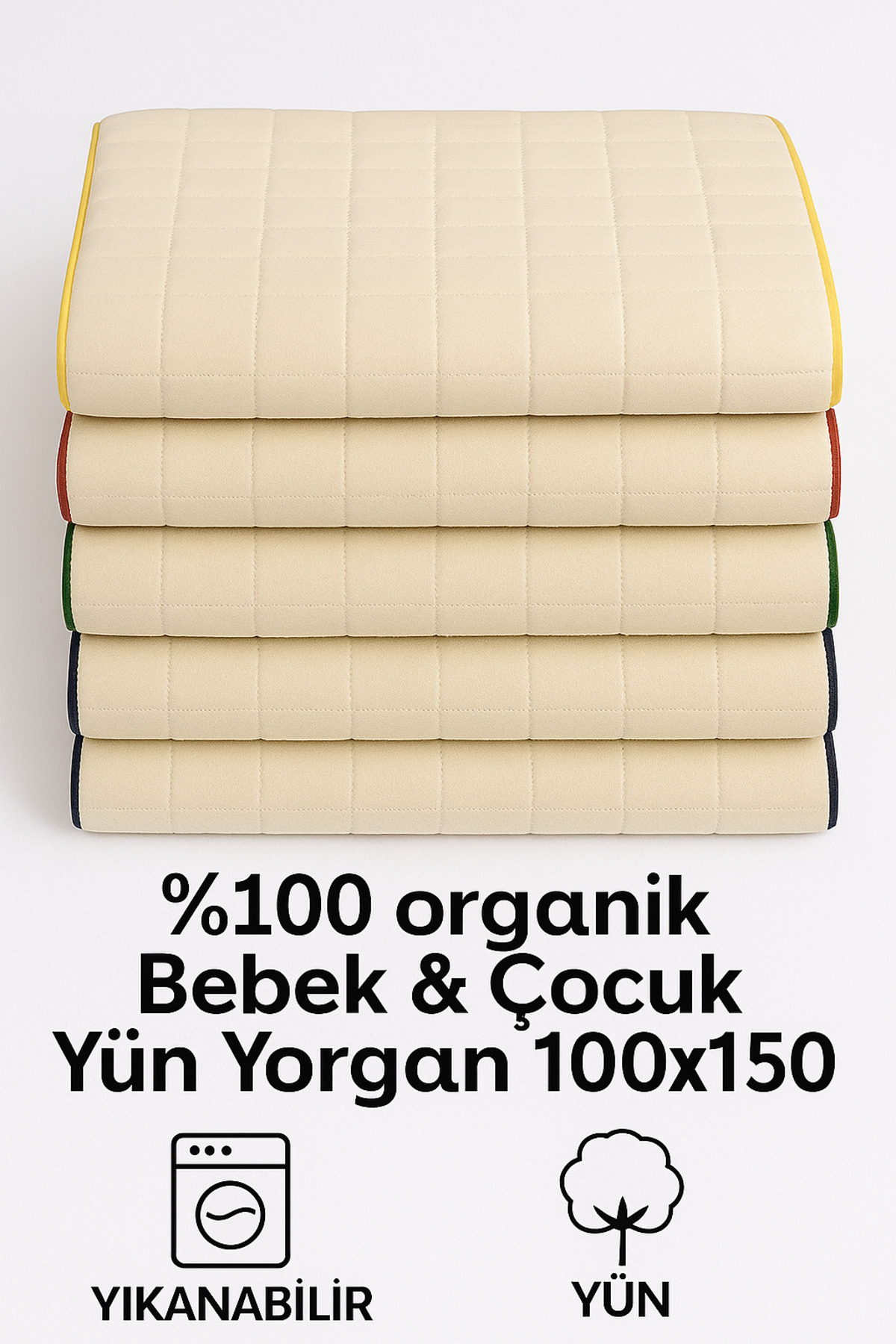 #### 🌿 Ürün Özellikleri: * **Ebat:** 100x150 cm (Bebek & Çocuk boyutu) * **Dolgu Malzemesi:** %100 Doğal Yün * **Dış Kumaş:** %100 Pamuk, Organik sertifikalı * **Yıkanabilir:** Evet, makinede düşük ısıda yıkanabilir * **Renk Seçenekleri:** Kırmızı, Sarı, Yeşil, Lacivert ve Gri biye detaylı * **Kullanım:** 4 Mevsim – Yazın serin, kışın sıcak tutar #### 🐑 Yünün Faydaları: * Doğal ısı yalıtımı sağlar * Nem dengeleyici özelliğiyle terlemeyi önler * Alerji riskini azaltır * Uzun ömürlü ve formunu korur #### 💧 Kolay Temizlik: **Meşeli Home %100 Organik Yün Yorgan** — bebeğinizin sağlığı, konforu ve mutluluğu için en doğal tercih.