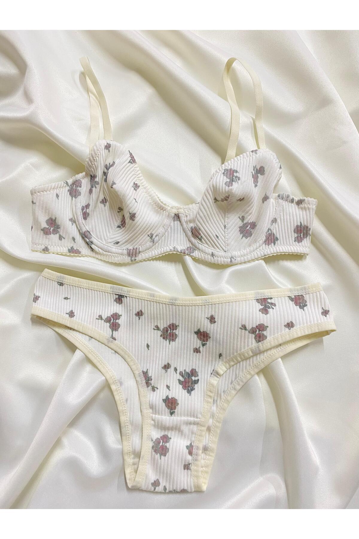 - Zarif çiçek desenleriyle süslenmiş, ekru rengindeki bu sütyen takımı, şıklığınızı ön plana çıkarır.