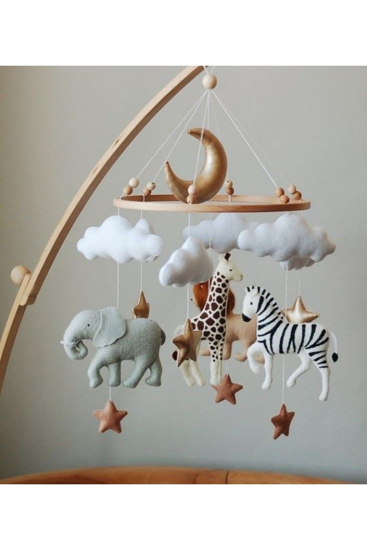Ahşap halkaya asılı yumuşacık keçe figürler — fil, zürafa, zebra, bulutlar, ay ve yıldızlar — bebeğinizin ilgisini çekerek hem görsel hem duyusal gelişimini destekler.
