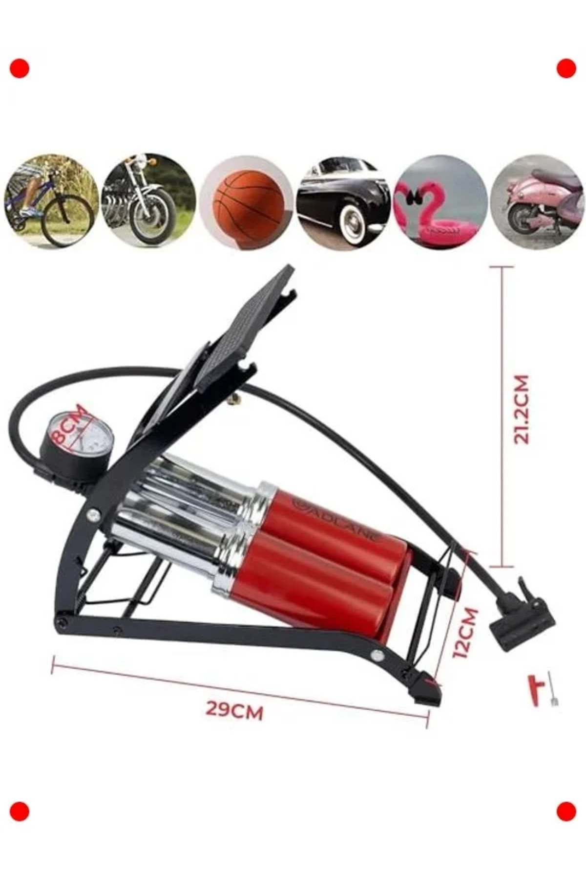 Bu çift silindir ayak pompası, geniş kullanım yelpazesiyle evde veya yolda vazgeçilmez bir yardımcıdır.