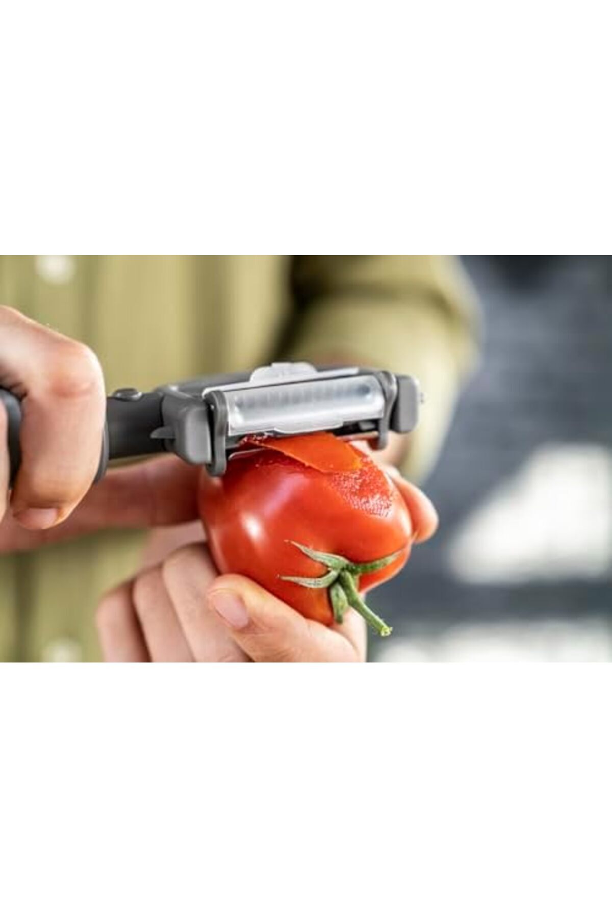 Üç değiştirilebilir bıçak: sert yiyecekler, yumuşak yiyecekler ve jülyen kesim için, iki soyucu tasarımı: Yuvarlak için I-şekli, uzun gıdalar için Y-şekli MotionBall teknolojisi: sahip soyma başlığı kesilecek ürüne uyum sağlar, kapaklar içerir Hem sol hem de sağ elle kullanım için Paslanmaz ve bulaşık makinesinde yıkanabilir Z-Cut 5'i 1 Arada Soyucu Gri