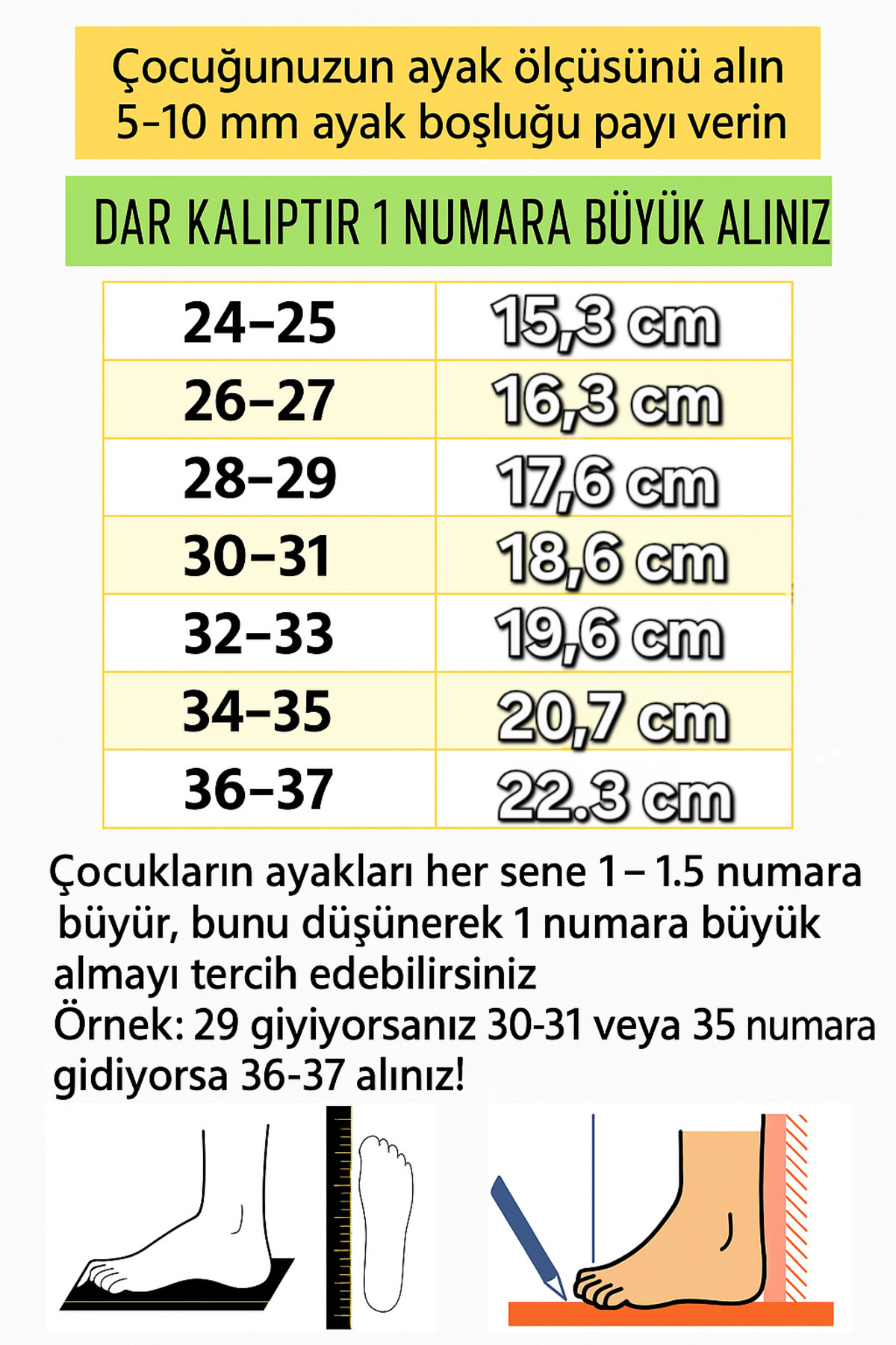 - Çocuklar için özel olarak tasarlanmış, yağmur ve kar koşullarına uygun PVC saya materyali ile dayanıklılık sunar.