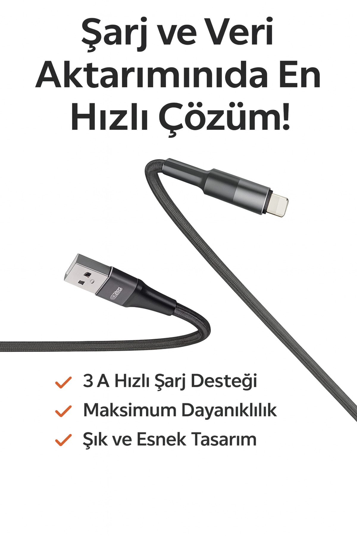 iPhone Uyumlu 1 Metre Hızlı Şarj ve Veri Aktarım Kablosu 3A Güçlü Akım Naylon Örgü Dayanıklı Tasarım