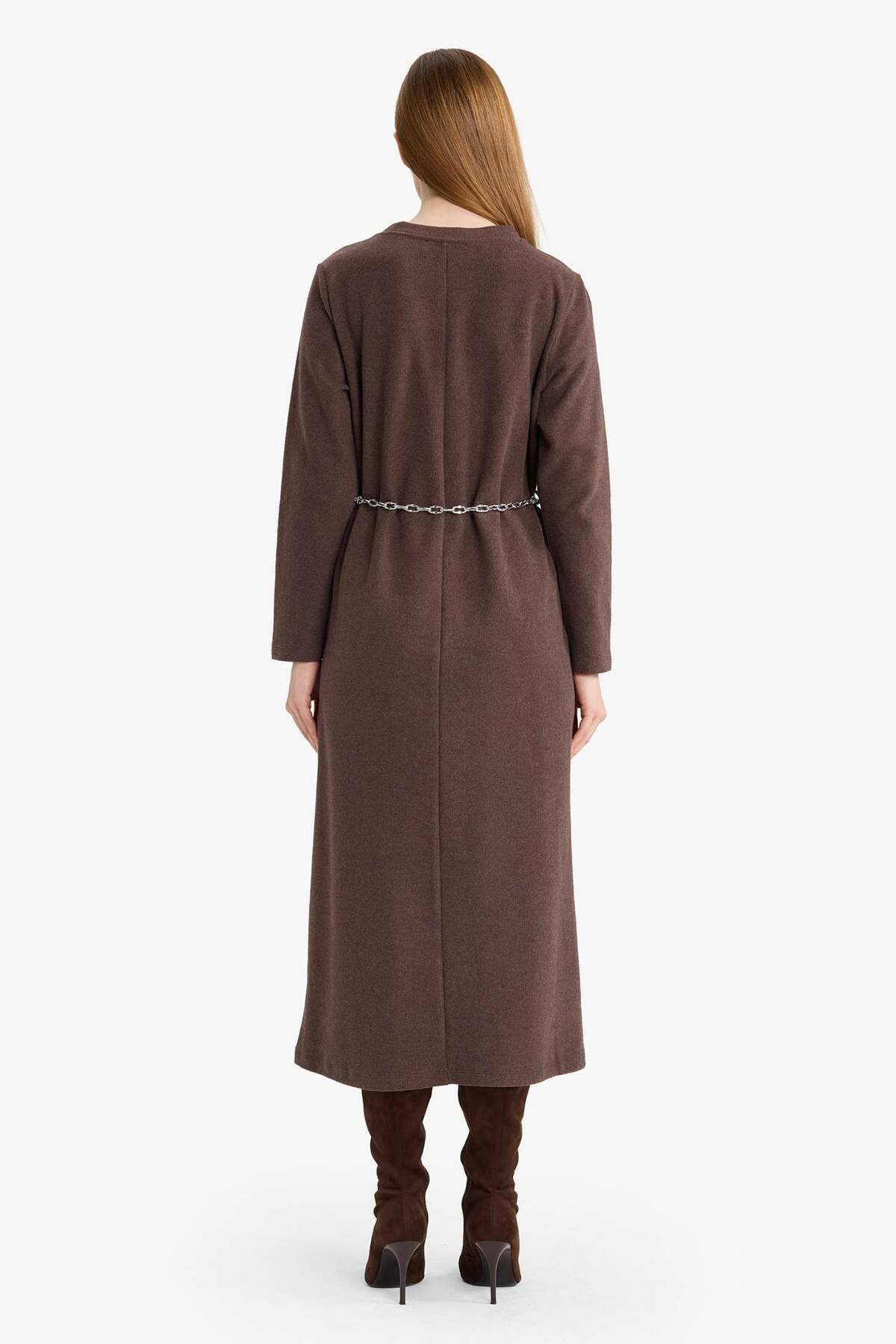 Regular fit kesimi ve kemer detayıyla bu bisiklet yaka uzun kollu maxi elbise, şık ve rahat bir kullanım sunar.
