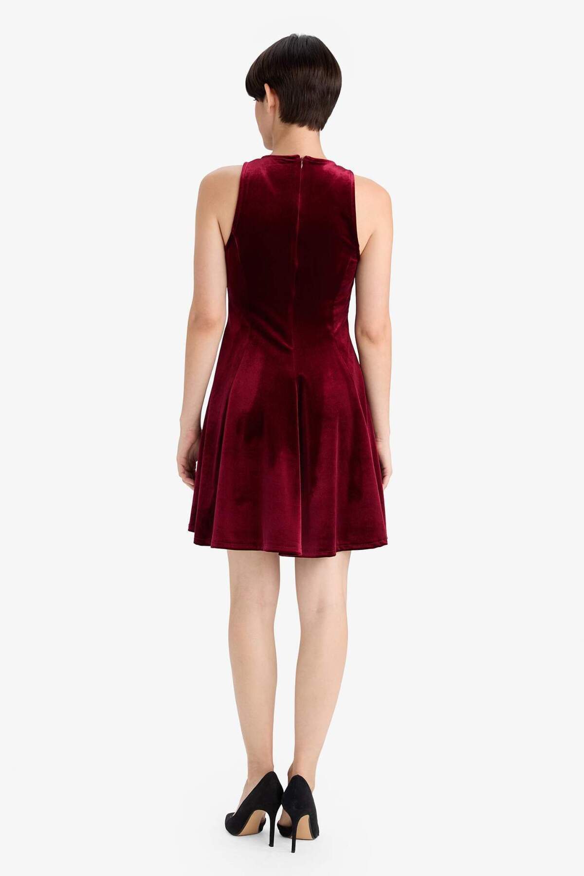 Bisiklet Yaka Kadife Kolsuz Mini Elbise, yumuşak kadife dokusu ve kolsuz tasarımıyla şık ve rahat bir görünüm sunar.