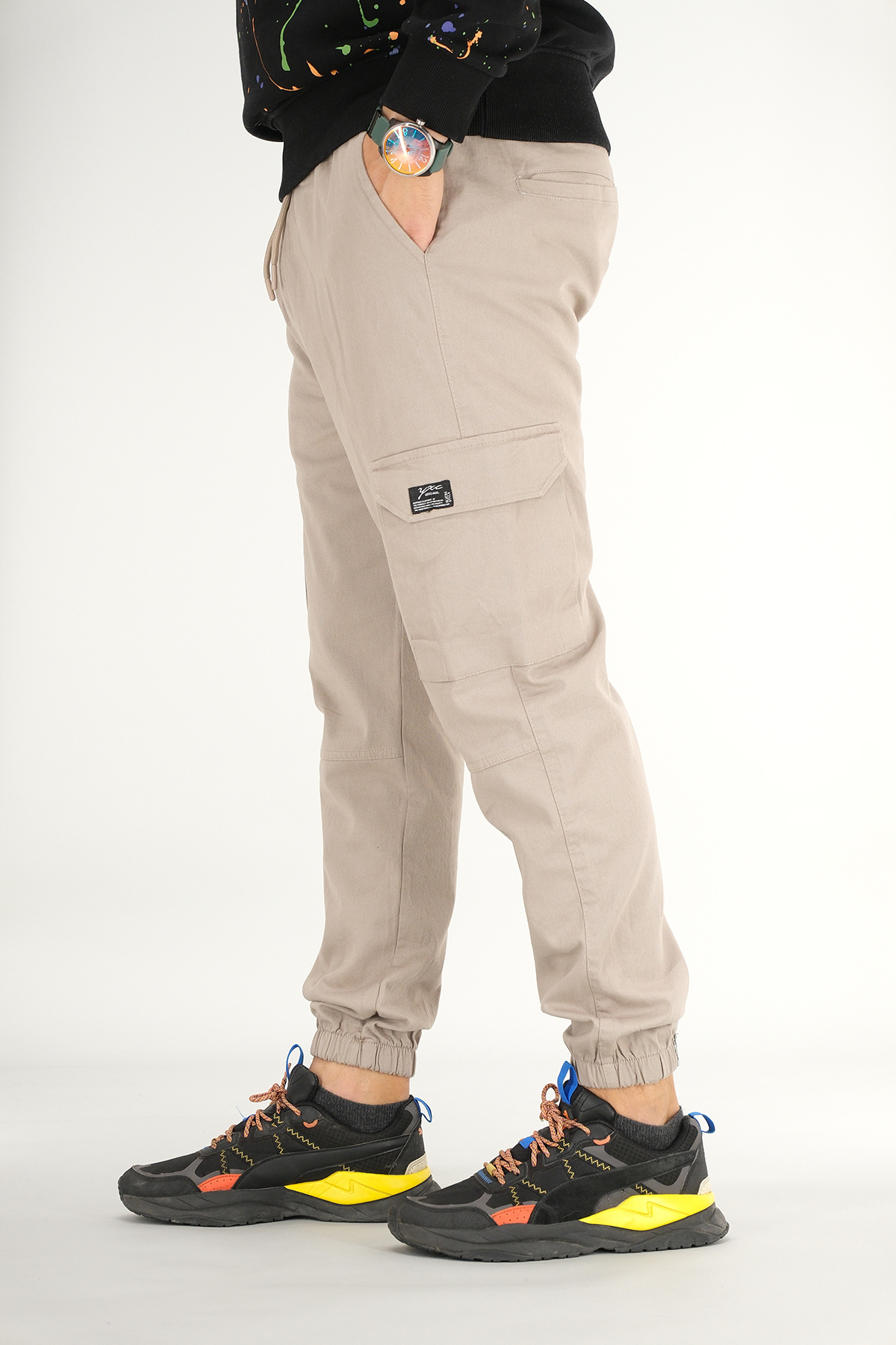 Erkek Taş Rengi Kargo Pantolon Rahat Kesim Pamuklu Lastikli Paça