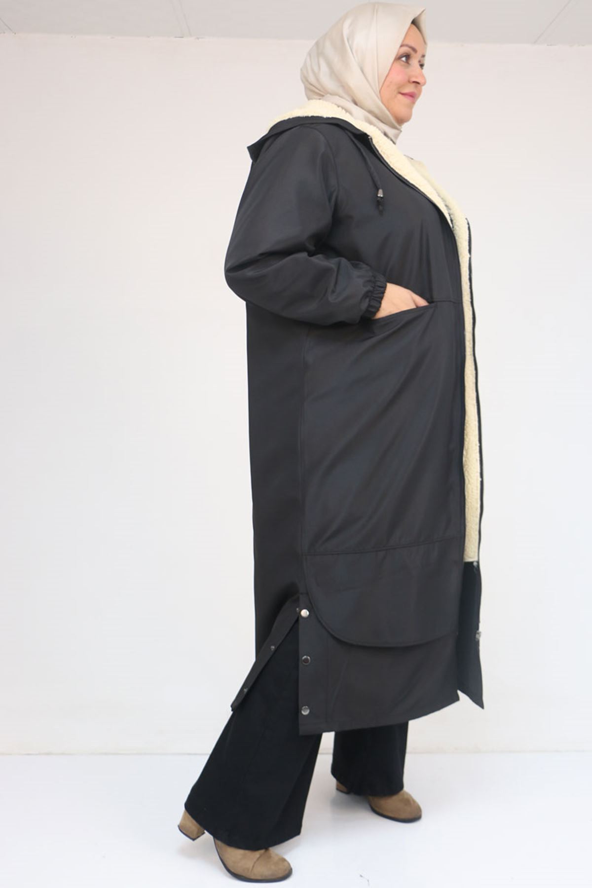 43062 Büyük Beden Kolları Lastikli Kapşonlu Bondit Kap - Siyah