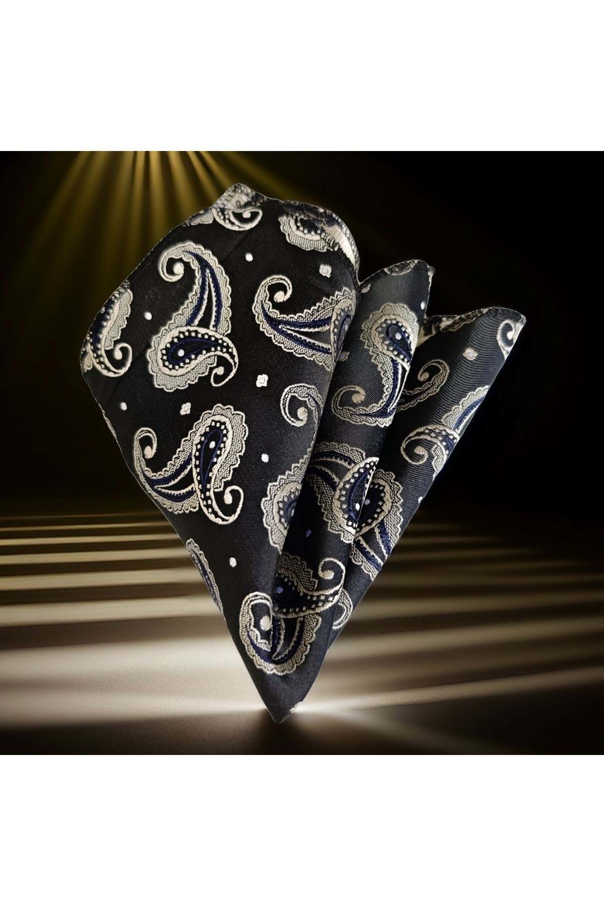 Siyah üzerine Fil Dişi Mavi Şal Desenli Elegant Cep Yaka Mendili