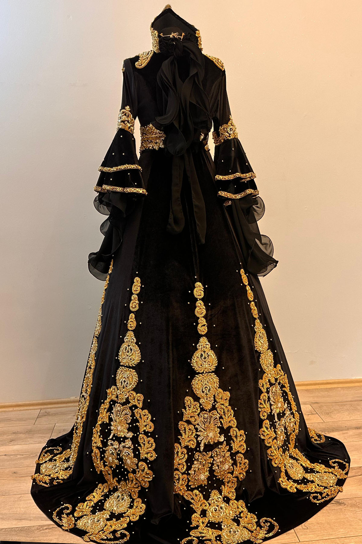 Kadife Siyah-Gold Kaftan Bindallı Kaftan Kına Gecesi Gelin Elbisesi Taç, Kemer, Kolye, Tarlatan Seti