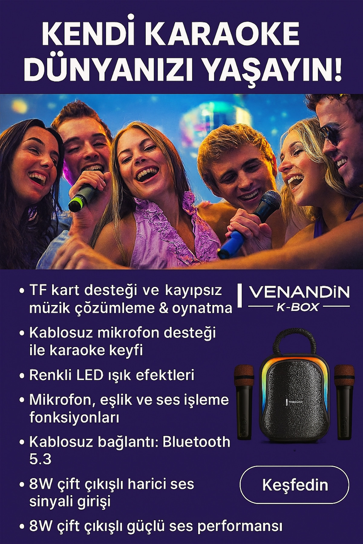 🎤 VENANDIN ELIXON K-BOX – Müzik Her Yerde Seninle! Renkli LED ışıkları, güçlü ses performansı ve çift kablosuz mikrofonuyla VENANDIN ELIXON K-BOX, eğlenceyi gittiğiniz her yere taşıyor.