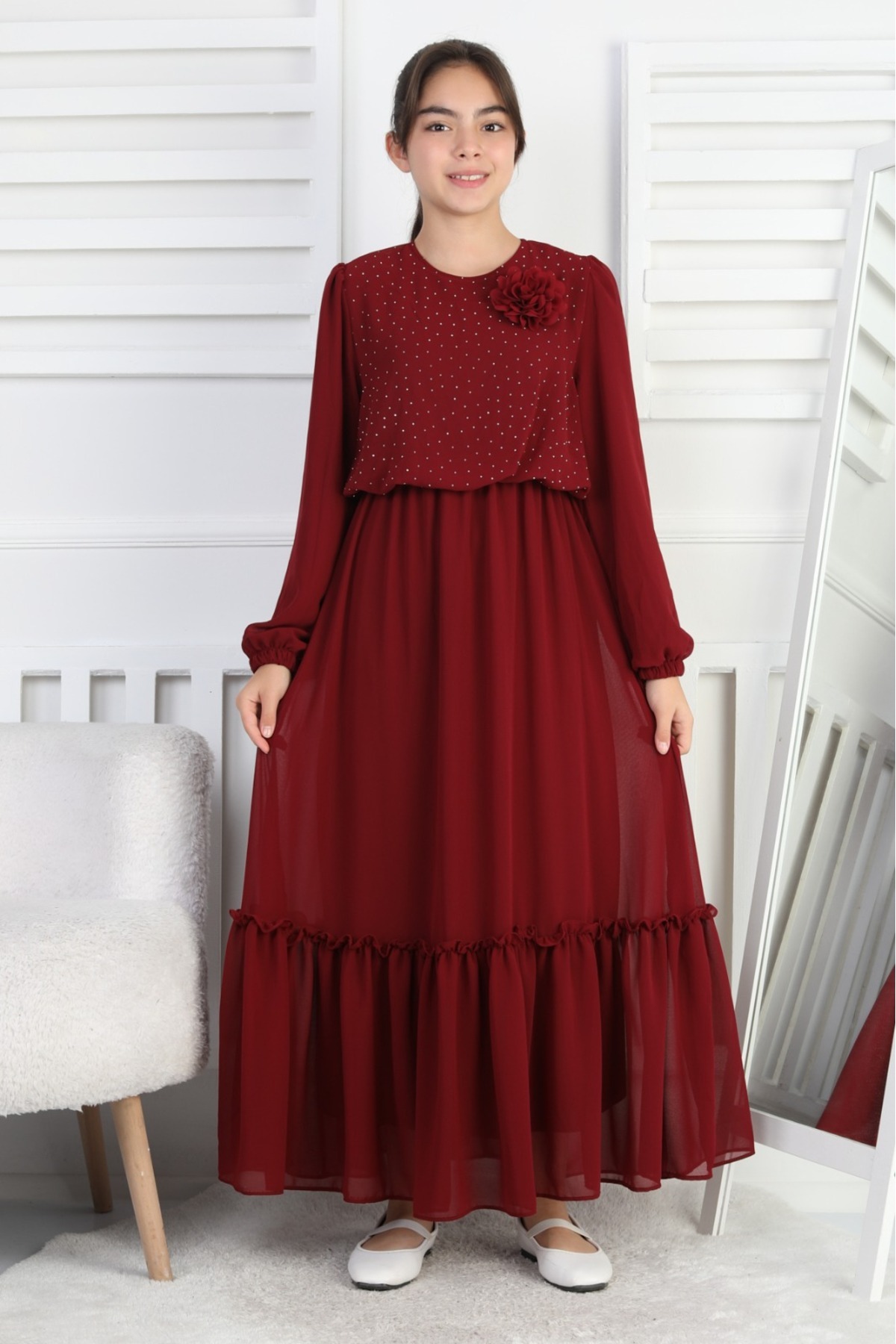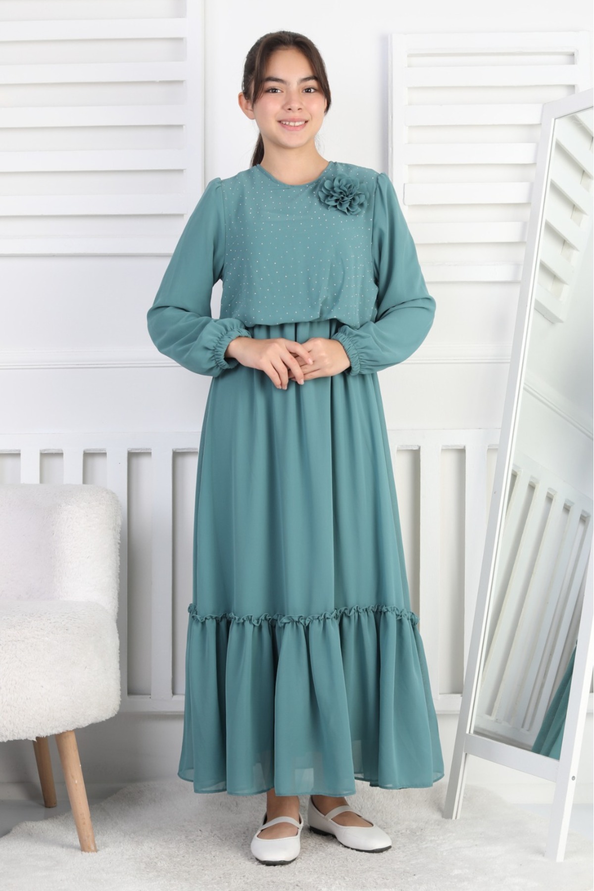 • - Genç kızlar için özel olarak tasarlanmış, şıklığı ve rahatlığı bir arada sunan şifon taşlı kız gez boy elbise.