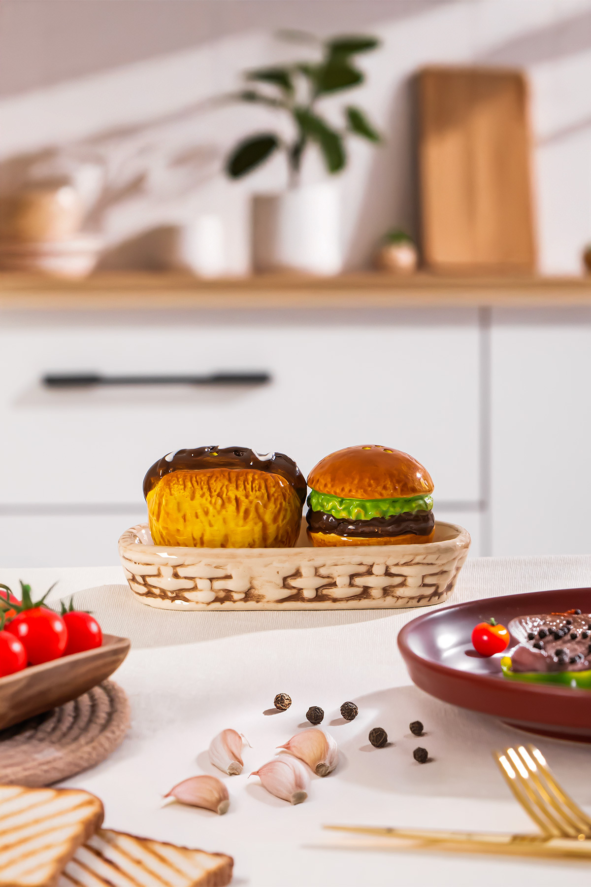 Özel Hamburger motifli tasarımı ve pratik kullanımı ile mutfağınıza ve sofralarınıza zarif bir dokunuş katacak Porsima Mıo-038 Hamburger Modelli 2li Standlı Tuzluk Biberlik Seti, hem estetik hem de işlevsellik arayanlara özel olarak tasarlanmıştır.